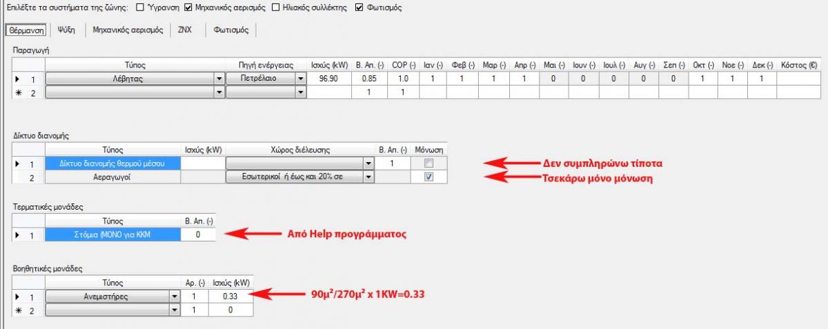 Καλησπέρα χρόνια πολλά και καλή χρονιά να έχουμε. Κτίριο γραφείων επιφάνειας ~90μ² θερμαίνεται με αερολέβητα πετρελαίου με Δ.Δ αεραγωγούς και Τ.Μ στόμια (τα χαρακτηριστικά του αερολέβητα συνημμένα), με 100% νωπό αέρα. Ο αερολέβητας θερμαίνει επίσης και βιοτεχνικό χώρο που είναι σε επαφή με τα γραφεία επιφάνειας ~180μ² Έχω συμπληρώσει τις καρτέλες θέρμανσης και μηχανικού αερισμού όπως στις φωτογραφίες. Έχω κάνει κάτι λάθος;;; Προφανώς δεκτή οποιαδήποτε παρατήρηση - υπόδειξη. Ευχαριστώ