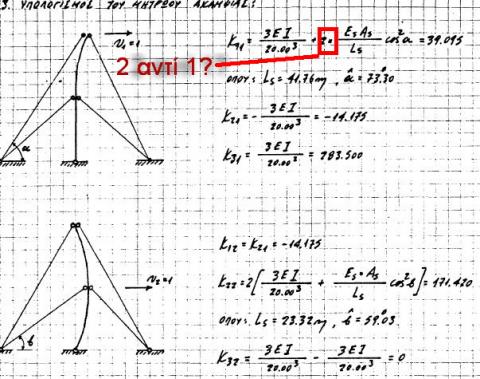 Γεια σας, το παρακάτω προβληματισμό το έχω γράψει για το sap2000 αλλά προφανώς ειναι ποιο γενικό το ερώτημα και όποιος προτείνει κνποια λύσει σε κάποιο άλλο πρόγραμμα καλοδεχουμενο. Eστω οτι εχω εναν στύλο πχ κεραιας που στην κορυφή δένεται με 2 συρματοσχυνα δεξια και αριστερα . Μιλαμε για φορεα 2D. Εστω η ακαμψια του στυλου Κ1 και των συρματοχοινων Κ2 το καθενα. Βαζοντας το μοντελο και για συρματοσχοινα Cable διαπιστωσα οτι για ακαμψια το sap λαμβανει υποψην Κ1+2*Κ2 δηλαδή και τα 2 συρματόσχοινα. Όμως ΠΑΝΤΑ το ένα συρματοσχοινο ΔΕΝ λαμβανεται υπόψην αφου θλίβετε, οποτε θα επρεπε η ακαμψία να ισούτε με Κ1+Κ2. Το συμπερασμα αυτο το είδα απλά απο την πρώτη ιδιοσυχνότα Τ του προγραμματος και με το αντιστοιχο με το χερι Τ=2π*sqrt(m/K) Το ερωτημα είναι , γινεται να ληφθει υπόψην συρματοσχοινο που θλιβεται καθε φορά αναλογα αν το συστημα μετακινείτε δεξιά ή αριστερά το οποιο δεν συμετέχει καθόλου? Σας επισυνάπτω ενα παρομοιο λυμενο με το χερι πρόβλημα με 2 στάθμες,