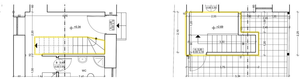 Καλησπέρα. Σε διώροφη κατοικία στην οποία βγάζω άδεια για μικρή προσθήκη δόμησης, επισκευές και διαρρυθμίσεις, κατασκευάζω εσωτερικό κλιμακοστάσιο ανόδου προς τον όροφο όπως φαίνεται στο σχέδιο. (Αριστερά ισόγειο, δεξιά ο όροφος.) Έχω "κιτρινίσει" το περίγραμμα που θεωρώ ότι δεν προσμετράται στον Σ.Δ. αντίστοιχα στο ισόγειο και στον όροφο. Μπορεί κάποιος να μου πει αν είναι σωστό;