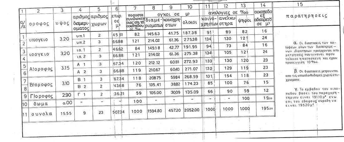 Καλησπέρα Άκη, ευχαριστώ πολύ για τις ευχές σου και για την άμεση απάντηση! Έχω το κανονισμό, είναι του '84 και γραμμένος κατά 50% στη καθαρεύουσα! 😡 Ήξερες οτι η λέξη ''ενιαύσιος'' σημαίνει ελληνιστί ''ετήσιος''? Αν ναι μπράβο σου... εγω όχι, μέχρι που έψαξα στο λεξικό του Μπαμπινιώτη (dum spiro spero!) Ευχαριστώ συνάδελφε @Pavlos33για την άμεση απάντηση! Δεν ξέρω αν βοηθάει αυτό που λέω, αλλά ο συντ. δόμησης είναι εξαντλημένος και ο τίτλος της οικ. άδειας είναι ''τριώροφη οικοδομή με υπόγειο'' το Νοέμβριο του '73. Το τριώροφη οικοδομή με υπόγειο, καταλαβαίνω είναι κτήριο με Υπ. + ΙΣ + Α' + Β' ...και δώμα στην οροφή του Β'. Στο πίνακα υπάρχει και Γ' όροφος, στη στάθμη της οροφής του Β' ορόφου (τμήμα δώματος) Περιμένω να πάρω τα σχέδια απο πολεοδομία, οπότε θα έχω πιο ολοκληρωμένη εικόνα.