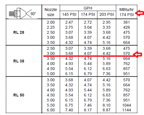 Από σελ. 6 του παραπάνω manual. Μετατροπές μονάδων 12 bar=174 PSI 4.07GPH=0,0154 m3/h 0.0154 m3/h x 850 kg/m3 = 13.09 kg/h (To 850 kg/m3 είναι η πυκνότητα του πετρελαίου ΤΟΤΕΕ 4 σελ.68) 570 MBtu/h=167 kW (Εδώ η ισχύς "παίζει" λίγο ανάλογα με την κατώτερη θερμογόνο δύναμη) 13.09 kg/h x 11.92 kWh/kg =156 kW
