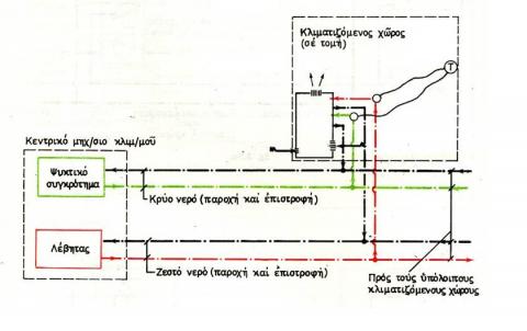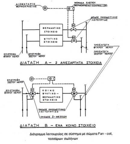 Στο σύστημα 4 σωλήνων υπάρχουν: - Ένας σωλήνας προσαγωγής ψυχρού νερού - Ένας σωλήνας προσαγωγής θερμού νερού - Ένας σωλήνας επιστροφής ψυχρού νερού και - Ένας σωλήνας επιστροφής θερμού νερού Στο σώμα παρέχεται μόνο ψυχρό ή μόνο θερμό νερό, από μία τρίοδη βαλβίδα στην είσοδο ή από 2 δίοδες βαλβίδες προοδευτικής λειτουργίας. Στη έξοδο του στοιχείου συνήθως τοποθετείται μία τρίοδη δύο θέσεων, που οδηγεί το νερό στον αντίστοιχο κλάδο επιστροφής.