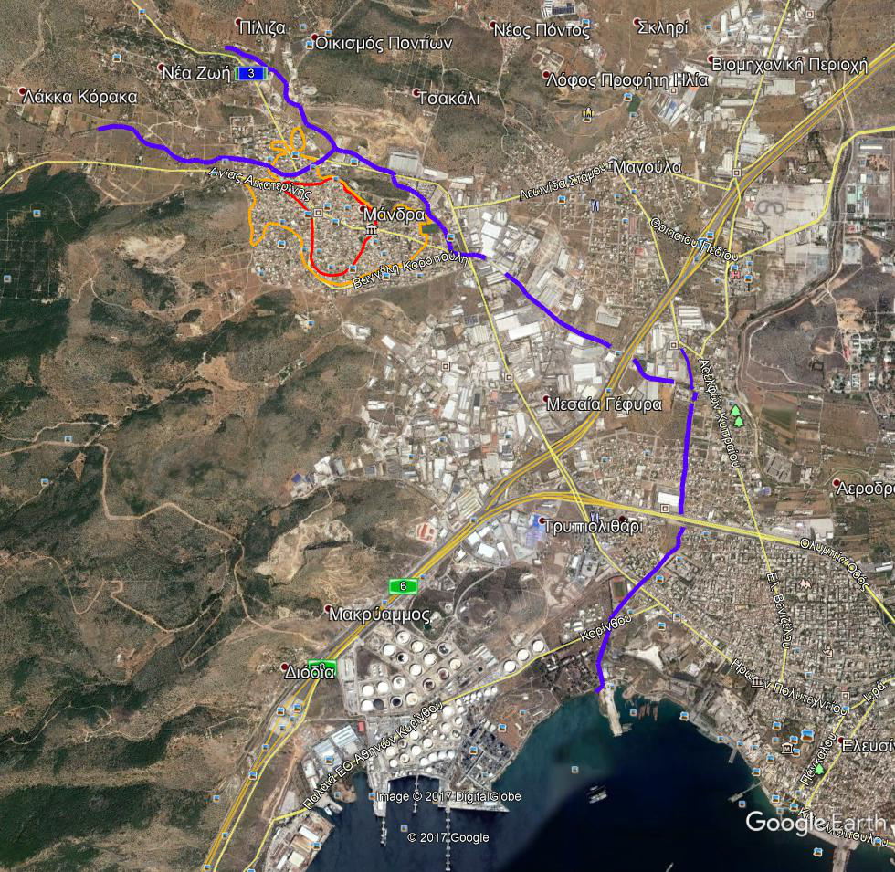 Νόμιζα ότι το ρέμα από Αγία Σωτήρα ήτανε μικρότερο. Βλέπω τώρα σε αεροφωτογραφία του '65 πως ήτανε τα πράγματα και διαπιστώνω: Ο προπολεμικός οικισμός (χονδρική εκτίμηση από την Α/Φ) είναι ο κόκκινος. Ο οικισμός του εξήντα (πορτοκαλί) προέκυψε από εκτός σχεδίου δόμηση και κατάτμηση αγροτεμαχίων (μπορεί να έγινε με κάποιο υποτυπώδες σχέδιο), χωρίς μέριμνα για το ρέμα από οδό Αγίας Αικατερίνης. Η Ελευσίνας - Θηβών ήταν ήδη χαραγμένη. Το ρέμα από Αγία Σωτήρα έχει σε όλες τις οδούς μικρά τεχνικά ή γεφυράκια. Σήμερα το ρέμα από Αγία Σωτήρα παραμένει ανοιχτό, κατά τμήματα διευθετημένο, με μοναδικό πρόβλημα το κτίριο στο "επίμαχο σημείο". Η Ελευσίνας - Θηβών περνάει την Αττική οδό σε στάθμη χαμηλότερη από εκείνη του ρέματος. επομένως, αν υπερχειλίσει το ρέμα, η φυσική διέξοδος των υδάτων είναι η κάτω διάβαση της Αττικής οδού. Η Ελευσίνα γιατί δεν πλημμύρισε; Ή μήπως πλημμύρισε; (λογικά θα έπρεπε, πέριξ του Πράκτικερ, και μεταξύ νεκροταφείων - γηπέδου) Σε ολόκληρη την περιοχή, το μοναδικό ρέμα που είναι πραγματικά διευθετημένο, είναι το ρέμα που κατεβαίνει δίπλα στον δρόμο Οινόης - Μαγούλας, στα τελευταία 4km πριν την θάλασσα (εκβάλει μεταξύ Ελευσίνας - Ασπρόπυργου).