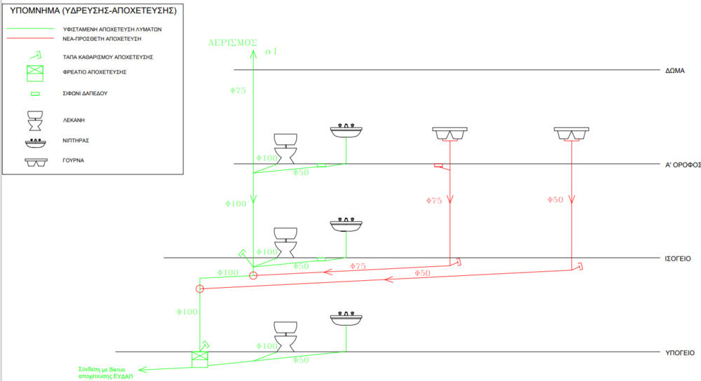 Συνάδελφοι Σε υφιστάμενο δίκτυο αποχέτευσης θα προστεθούν 3 υδραυλικοί υποδοχείς: - Νιπτήρας - Γούρνα πλυσιμάτων - Σιφώνι λεκάνης δαπέδου (εντατικό πλύσιμο σκευών/καζανιών) Επισυνάπτω ενδεικτικό κατακόρυφο αποχέτευσης: Με πράσινο χρώμα το υφιστάμενο δίκτυο αποχέτευσης (αποτύπωση) Με κόκκινο χρώμα το πρόσθετο/νέο δίκτυο Ερωτήσεις: - Η προσθήκη αντιβαίνει την ΤΟ.ΤΕΕ. Αποχέτευσης? - Οι νέες κατακόρυφες χρειάζονται ανεξάρτητες στήλες αερισμού για την απρόσκοπτη λειτουργία των υποδοχέων? - Το σιφώνι δαπέδου (δίπλα στη νέα γούρνα πλυσιμάτων) θα έχει εντατική χρήση (άδειασμα καζανιού 1000L) και θα συνδέεται στην ίδια στήλη με το WC του Ισογείου - ενδέχεται να επηρεάζει την λεκάνη του Ισογείου, λόγω της υψομετρικής διαφοράς? - Άλλα πιθανά προβλήματα? Ευχαριστώ