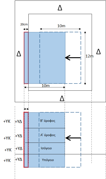 Αν και έχει συζητηθεί πολλάκις εδώ. Προς επιβεβαίωση απόψεων - Μετακίνηση κτιρίου εντός Δ χωρίς καμία ΥΔ και ΥΚ, αναγκαστικά βάζουμε Φ.Κ. με υπέρβαση πλάγιων αποστάσεων ΚΑΙ Υ.Δ ΚΑΙ Υ.Κ. με την επιφάνεια εντός Δ? Αν έχουμε και ορόφους Υ.Δ. και Υ.Κ. για ΟΛΟΥΣ τους ορόφους? Παραθέτω το παρακάτω εποπτικό βοήθημα: ΜΟΝΟ μετακίνηση κτιρίου εντός Δ (ενιαίο ιδιοκτησιακά χωρίς σύσταση). Βάζουμε (?) Υ.Π.Α <20% Υ.Δ = 20cm x 12m (x4?) = 9.6m2 Υ.Κ = 20cm x 12m (x4?) = 9.6m2