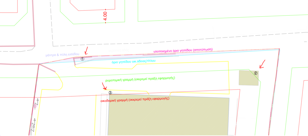 Σε ευχαριστώ @dimitris GM Το συγκεκριμένο ακίνητο βρίσκεται εντός ΓΠΣ Παλλήνης (ΦΕΚ 89ΑΑΠ/2014). Η Πράξη Εφαρμογής βρίσκεται στο τρίτο και τελικό στάδιο και αναμένεται η κύρωσή της (η μελέτη προβλέπεται να ολοκληρωθεί τον Μάιο του 2023...). Στο σχέδιό μου το "cyan" όριο είναι η αποτύπωση των τίτλων και το "magenta" όριο είναι η αποτύπωση της πραγματικότητας.
