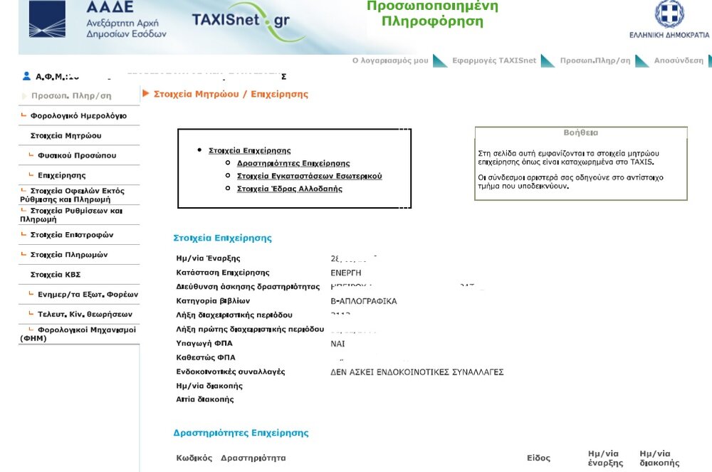 καλησπέρα. Επαγγελματική ταυτότητα δεν νομίζω να έχω από ΤΕΕ. Δεν θυμάμαι να μου είχαν δώσει κάτι. Θα ψάξω. Αν την βρώ (είχε εκδοθεί το 2005 η άδεια επαγγέλματος) θα ισχύει? Η ερώτησή μου είναι η εξής: Αν έχω μαζί μου: 1) το κλασσικό έντυπο "τύπου Α" https://forma.gov.gr/docs/vevaiosi-kikloforias.pdf χειρόγραφα συμπληρωμένο με σφραγγίδα μου κάτω και υπογραφή 2) και μια εκτύπωση απο το TaxisNet Από Προσωποποιημένη πληροφόρηση>Στοιχεία Μητρώου/Επιχείρησης είμαι οκ?? Διαβάζω διάφορα σε κάποια site, μέχρι και οτι το τύπου Α δεν συμπληρώνεται χειρόγραφα διάβασα κάπου αλλά αντεί τα στοιχεία απο το σύστημα. Στην τηλεόραση χτες άλλος έλεγε οτι πρέπει να έχουμε το Ε3. Επίσημα είναι κάπου γραμμένα τι ισχύει? Οχι απο διάφορα site γιατι ο καθένας λεει τα δικά του. Ευχαριστώ πολύ! Εκτύπωση απο TaxisNet εννοώ αυτήν που επισυνάπτω (* την οποία επειδή την εκτυπώνω σε μαύρο μελάνι μόνο, οι ΚΑΔ και οι δραστηριότητες φαίνονται πολύ αχνά. Μπορώ να το έχω και σε ηλεκτρονική μορφή στο κινητό) edit: εδώ https://news.b2green.gr/2750/μετακινησεις-για-λόγους-εργασίας-εκδ γράφει "γ) Στην περίπτωση αυτοαπασχολούμενων, ελεύθερων επαγγελματιών και επιτηδευματιών συμπληρώνεται ηλεκτρονικά από τους ίδιους η αντίστοιχη υπεύθυνη δήλωση του άρθρου 8 του ν. 1599/1986 στο ΠΣ «ΕΡΓΑΝΗ» με τους κωδικούς TAXISNET ή πάγια βεβαίωση κίνησης (τύπου Α) που λαμβάνεται από την ηλεκτρονική σελίδα forma.gov.gr. Η συμπλήρωση της υπεύθυνης δήλωσης ή της βεβαίωσης κίνησης πρέπει να λάβει χώρα το αργότερο πριν από τη μετακίνησή τους και να επιδεικνύεται, σε έντυπη ή ηλεκτρονική μορφή, στα αρμόδια ελεγκτικά όργανα μαζί με εκτύπωση από το πληροφοριακό σύστημα TAXIS των φορολογικών στοιχείων φυσικού προσώπου και επιχειρηματικής δραστηριότητας ή αντίστοιχη ηλεκτρονική απεικόνιση." Η συμπλήρωση της υπεύθυνης δήλωσης ή της βεβαίωσης κίνησης πρέπει να λάβει χώρα το αργότερο πριν από τη μετακίνησή τους <-- αφού η βεβαίωση τύπου Α δεν έχει συμπλήρωση ημερομηνίας. Απλά γράφεις τις ώρες μετακίνησης, π.χ 8πμ-12μμ και 12μμ-18μμ.??