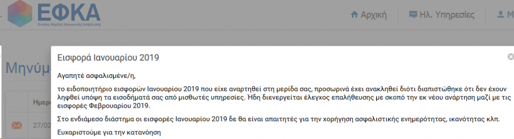 Συνάδελφοι το link http://www.eteaep.gov.gr/web/ νομίζω ότι λύνει αρκετές απορίες ΕΙΣΦΟΡΕΣ ΜΗ ΜΙΣΘΩΤΩΝ Στις ηλεκτρονικές υπηρεσίες του ΕΤΕΑΕΠ, στην επιλογή «Εισφορές μη μισθωτών ΕΤΕΑΕΠ» αναρτήθηκαν τα πρώτα ειδοποιητήρια των εισφορών 250.000 μη μισθωτών και αυτοαπασχολούμενων για επικουρική ασφάλιση και εφάπαξ παροχή, σύμφωνα με το νέο νομοθετικό πλαίσιο (Ν.4578/18). Τα ειδοποιητήρια αφορούν τις εισφορές μηνός Ιανουαρίου και Φεβρουαρίου 2019, καθώς και τις δύο πρώτες δόσεις από τις 36 του διαστήματος 1/1/2017 – 31/12/2018. Πιο συγκεκριμένα, οι ασφαλισμένοι λαμβάνουν τρία ειδοποιητήρια: το πρώτο με την εισφορά του Φεβρουαρίου 2019 και αναδρομικά τον Ιανουάριο του 2019, το δεύτερο με την πρώτη από τις 36 δόσεις για το διάστημα 1/1/2017 έως 31/12/2017 και το τρίτο με την πρώτη δόση από τις 36 δόσεις του διαστήματος από 1/1/2018 έως 31/12/2018. Οι ασφαλιστικές εισφορές καταβάλλονται σε μηνιαία βάση, με καταληκτική ημερομηνία πληρωμής την τελευταία εργάσιμη του επόμενου μήνα. Ειδικά κατά την πρώτη έκδοση των ειδοποιητηρίων, ως καταληκτική ημερομηνία καταβολής ορίζεται η 12η Απριλίου 2019, με αντίστοιχη εναρκτήρια ημερομηνία πληρωμής την 5η Απριλίου 2019. Υπενθυμίζεται πως η ελάχιστη μηνιαία εισφορά για επικούρηση και εφάπαξ τον μήνα Ιανουάριο ορίζεται στα 64,5 ευρώ (41,02 ευρώ για επικούρηση και 23,43 ευρώ για εφάπαξ). Ωστόσο από τον Φεβρουάριο, λόγω της αύξησης του κατώτατου μισθού, οι εισφορές αναπροσαρμόζονται στα 71,50 ευρώ το μήνα (45,50 ευρώ για επικούρηση και 26 ευρώ για εφάπαξ). Από 1η Ιουνίου 2019, το ασφάλιστρο της επικουρικής αναπροσαρμόζεται στο 6,5% από 7% σήμερα για όλους, οπότε τα ποσά θα αναπροσαρμοστούν αναλόγως. Για τις ασφαλιστικές αυτές εισφορές, οι ασφαλισμένοι θα λάβουν ξεχωριστό ειδοποιητήριο σε μεταγενέστερο χρόνο, που θα ορίζει το ύψος της εισφοράς και τις δόσεις αποπληρωμής των παλαιών τους οφειλών.