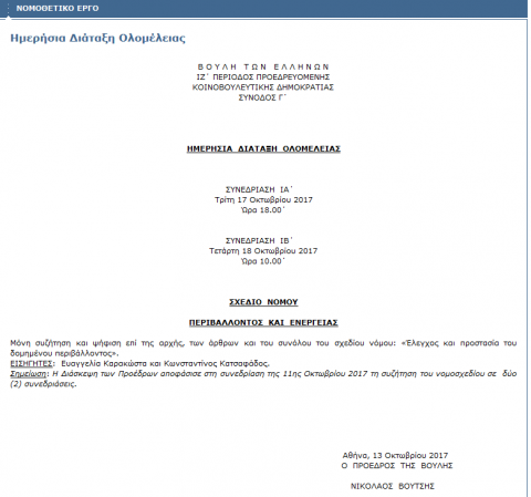 Κατατέθηκε το σχέδιο νόμου του ΥΠΕΝ για δομημένο περιβάλλον 20 Σεπτεμβρίου 2017 ΔΕΛΤΙΟ ΤΥΠΟΥ Κατατέθηκε σήμερα στη Βουλή το σχέδιο νόμου «Έλεγχος και προστασία του δομημένου περιβάλλοντος» του Υπουργείου Περιβάλλοντος και Ενέργειας. Στόχος του σχεδίου νόμου, που αναμένεται να ψηφιστεί άμεσα, είναι η αντιμετώπιση των πρωταρχικών αιτίων που οδήγησαν στη δημιουργία ενός άναρχου και αυθαίρετου δομημένου περιβάλλοντος. Ενόψει της ψήφισης του σχεδίου νόμου και για να μην υπάρξει κενό νόμου δόθηκε παράταση στην προθεσμία υπαγωγής στον ισχύοντα Ν.4178/2013 για τη ρύθμιση αυθαίρετης δόμησης. Τη σχετική Κοινή Υπουργική Απόφαση υπέγραψαν οι Υπουργοί, Οικονομικών, Ευκλείδης Τσακαλώτος και Περιβάλλοντος και Ενέργειας, Γιώργος Σταθάκης. http://www.ypeka.gr/Default.aspx?tabid=785&sni[524]=5162&language=el-GR Το νομοσχέδιο εδώ http://www.hellenicparliament.gr/Nomothetiko-Ergo/Katatethenta-Nomosxedia?law_id=d051d387-60d7-4960-b075-a7f4013307ea