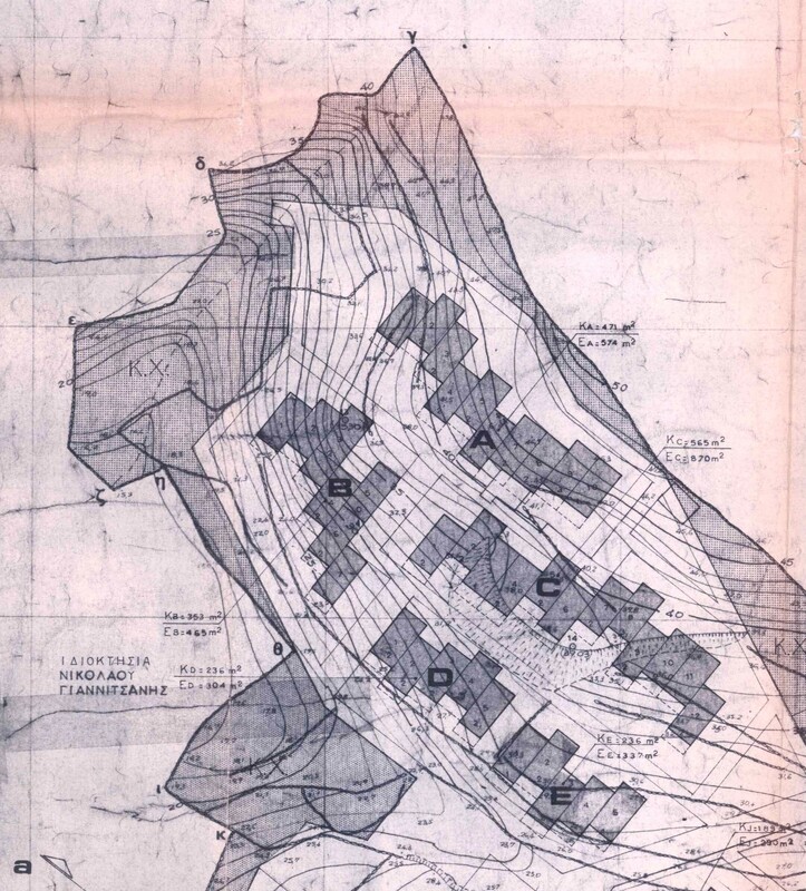 Υπήρχε ένα τοπογραφικό που έχει προσαρτηθεί στο συμβόλαιο της σύστασης, το οποίο δεν βρέθηκε στο αρχείο του συμβολαιογράφου. Το μόνο που υπάρχει είναι ένα μεταγενέστερο, με την διάταξη των λαχιδίων και συνόδευε το προεδρικό διάταγμα που εκδόθηκε, αλλά δεν έχει τα ίδια γράμματα στην περιγραφή της έκτασης και δεν μπορώ να το ταυτίσω. Θα το συζητήσω όμως με τον συμβολαιογράφο αν μπορεί να κάνει παραπομπή σε αυτό, βάσει του συμβολαίου της σύστασης, μήπως ξεμπλοκάρουμε μέχρι νεωτέρας... Η αρχική έκταση ήταν διπλάσια. Το 50% το παραχώρησαν στο δημόσιο με συμβολαιογραφική πράξη. Αυτή ήταν η υποχρέωση για την εφαρμογή αυτού του συστήματος, από όσα διαβάζω στο συμβόλαιο