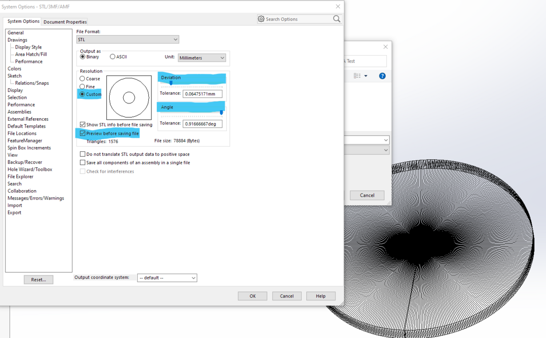 Οι γωνίες που βλέπεις στην οθόνη έχουν να κάνουν με τις ρυθμίσεις των γραφικών μέσα από το solidworks. Επίσης μας δίχνεις το sketch όπου πάντα ή ανάλυση είναι μικρότερη σε σχέση με το solid κομμάτι. Αν πας στο Tools->Options->Document Properties->Image Quality μπορείς να πάς τη ρύθμιση για το "Shaded and Draft Quality HLR/HLV resolution" τέρμα δεξιά και όλα θα δείχνουν τέλεια, φτάνει να μπορεί να το σηκώσει η κάρτα γραφικών σου. Οι γωνίες που βλέπεις στο εκτυπωμένο κομμάτι έχουν να κάνουν με την ανάλυση του stl αρχείου κατά την μετατροπή του και δεν έχουν ΚΑΜΙΑ σχέση με τις γωνίες που βλέπεις στην οθόνη σου όταν κάνεις zoom. Όταν πας να σώσεις σαν STL πήγαινε στο options Εκεί μπορείς να διαλέξεις καλύτερη ανάλυση και angular tolerance για το STL αρχείο σου. Και πάλι, όσο μεγαλύτερη ανάλυση, τόσο μεγαλύτερο το αρχείο και τόσο πιο πολύ χρόνο θα σου πάρει για εκτύπωση. Αν διαλέξεις "preview before saving" θα σου δείξει στην οθόνη σου το wiremesh του STL αρχείου. -