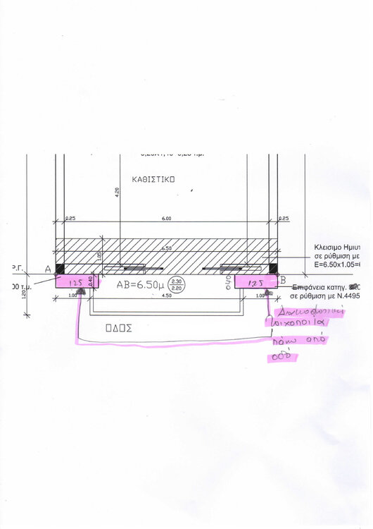 5. διακοσμητικη τοιχοποιια.pdf Σε οριζόντιο ιδιοκτησία γ΄ ορόφου κατασκευάστηκε διακοσμητική τοιχοποιία 2*1,25*0,40 πάνω από οδό από τον α΄ όροφο μέχρι τον γ΄ όροφο. Ρυθμίζεται ο γ΄ όροφος. Η διακοσμητική τοιχοποιία εφάπτεται σε ημ. Χώρο που κλείστηκε κατηγορίας 4. Η επέκταση αυτή της διακοσμητικής τοιχοποιίας είναι μικρότερη του 5% των εξωτερικών διαστάσεων. Η επιφάνεια της οριζόντιου ιδιοκτησίας, αν συμπεριληφθούν και οι υπόλοιποι κλειστοί αυθαίρετοι χώροι σε ρύθμιση, μεταβάλλεται πάνω από 5%. Στον υπολογισμό επιφανείας <5% για την κατηγορία 3ιειε προστίθενται και οι χώροι σε ρύθμιση της κατηγορίας 4; Επίσης το ότι η διακοσμητική τοιχοποιία εφάπτεται σε χώρο σε ρύθμιση δημιουργεί κώλυμα; Ευχαριστώ εκ των προτέρων Μην ανοίγεις χωρίς ουσιαστικό λόγο νέο θέμα και χωρίς πρώτα να κάνεις αναζήτηση σε ήδη υπάρχον, με ίδιο ή παραπλήσιο περιεχόμενο. Το θέμα σου συγχωνεύτηκε στο παρόν. Διάβασε προσεκτικά τους κανόνες συμμετοχής στο φόρουμ. Pavlos33 διακοσμητικη τοιχοποιια.pdf
