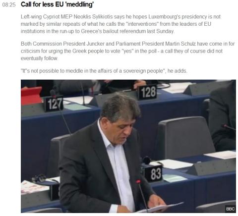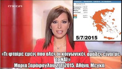 "Δεν έχουν περάσει πολλές μέρες όταν ο Κλέων Γρηγοριάδης εμφανίστηκε στο δελτίο ειδήσεων του MEGA και ρώτησε την κυρία Σαράφογλου αν θεωρεί ότι δίνουν τον ίδιο χρόνο στην άποψη του ναι και την άποψη του όχι στο MEGA. Τότε η διορατική κ.Σαράφογλου και γνώστρια των κοινωνικών και πολιτικών συσχετισμών, του απάντησε με το εξής αμίμητο: "Tι φταίμε εμείς αν όλες οι κοινωνικές ομάδες ψηφίζουν ναι;" Μάλλον επηρεάστηκε από τις δημοσκοπήσεις που έπεσαν όλες μέσα! Ο Κλέων Γρηγοριάδης αντέδρασε στην αστεία αυτή τοποθέτηση και μόλις μίλησε για χούντα των ΜΜΕ η παρουσιάστρια τον έκοψε. Αναρωτιέμαι πως με το ΟΧΙ να φτάνει το 61,3%, όλες οι κοινωνικές ομάδες ήταν υπέρ του ΝΑΙ." Το βίντεο για όσους δεν το είδαν: http://tinyurl.com/pqskegx Άρχισε το κούρεμα στις Τράπεζες: