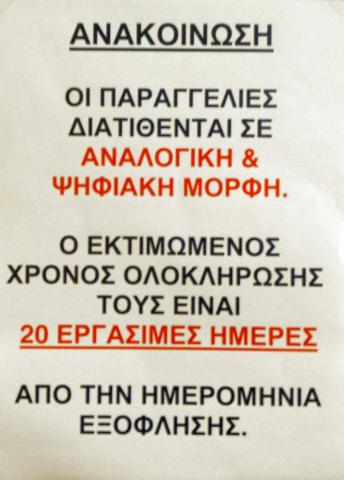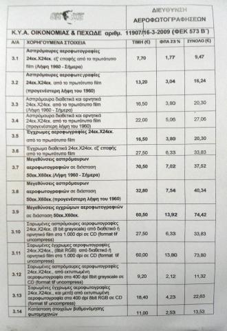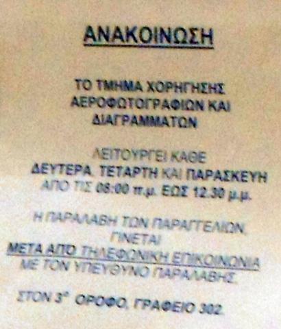 5. Καλησπέρα Συνάδελφοι, Ωράριο Λειτουργίας: Σημείωση: Μέχρι 12:30 διανέμονται αριθμοί προτεραιότητος και μέχρι 14:00 εξυπηρετούνται οι έχοντες λάβει αριθμό προτεραιτότητος. Συνιστάται να εισκομισθούν οι συντεταγμένες Χ, Υ του κτίσματος όπως προκύπτουν από την ιστοσελίδα http://tinyurl.com/2a2gvgr Χρόνος Παραλαβής: Σημείωση: Ο χρόνος "μετρά" μετά την αποστολή του αποδεικτικού καταθέσεως μετά του τιμολογίου που εκδίδεται και παραλαμβάνεται κατόπιν επιλογής αεροφωτογραφίας/ων Τιμοκατάλογος: Σας Ευχαριστούμε Για την Προτίμησή Σας ! Ε.Κ.ΧΑ. Α.Ε. (Τιμολέοντος Βάσσου 11-13, Πλατεία Μαβίλη | Τηλ.: 211-1044627, 211-1044687, 211-1044690)