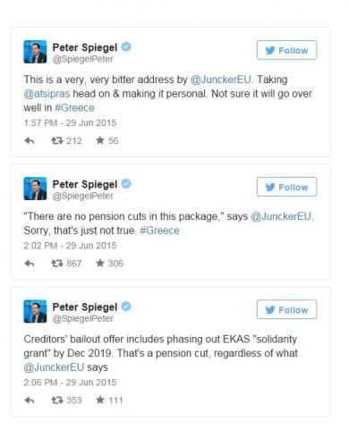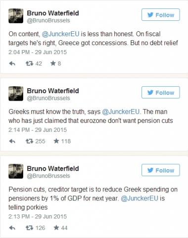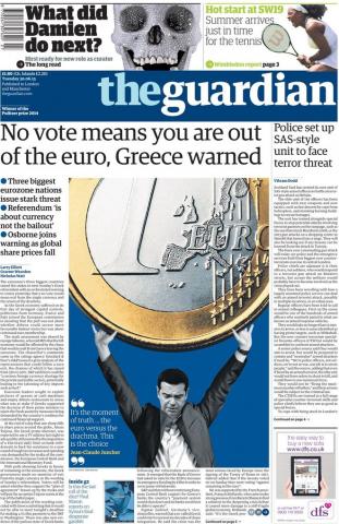 3. @project.breeze Να 'σαι Καλά Συνάδελφε. Μήπως γνωρίζεις τον τίτλο του εγγράφου από το οποίο προέρχεται το απόσπασμα που είχες αναρτήσει ; Κάποιος φίλος σου δικηγόρος στο είχε στείλει, κάτι τέτοιο είχες αναφέρει. @Konstantinos IB Όλοι μαζί συντεταγμένα εντός και εκτός έχουν βαλθεί να παρερμηνεύσουν το ερώτημα κατά τη συνήθη τακτική τους. Λέμε π.χ. Άσπρο ή Μαύρο ; Θα αρχίσουν μετά να σου λένε σου λέει όχι μαύρο γιατί το μαύρο θα ξεθωριάσει και από κάτω έχει ροζ και το ροζ θα σημαίνει ότι είσαι gay, δεν είσαι gay όμως οπότε πρέπει να ψηφίσεις άσπρο. Δε βγάζεις άκρη. Πάει το μαγείρεμα σύννεφο. Σου λέει ο άλλος μα το είπε ο Γιούνκερ. Δες εδώ πρωτοσέλιδο της Guardian: Δεν είναι η μικρή Ελλαδίτσα. Η πετονιά τραβάει πολύ δυνατά.