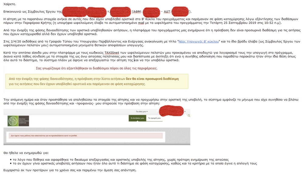 Χαίρετε. Παραθέτω screenshot από mail με ερώτημα που έστειλα στο info του προγράμματος (αν δεν είναι σαφές το τι συνέβη με την αίτηση της πελάτισσας μου, ευχαρίστως να επανέλθω με διευκρινήσεις). Θα ήθελα να ρωτήσω την ομήγυρη αν παρατηρήθηκε κάτι αντίστοιχο από άλλους/ες, γιατί αν τα έχω καταλάβει καλά μιλάμε για μια μαύρη τρύπα οριστικής υποβολής αιτήσεων που άνοιξε για ένα (τουλάχιστον) βράδυ... -