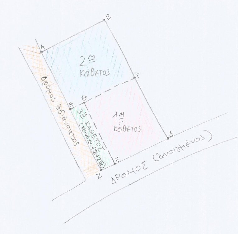 Καλημέρα Δημήτρη. Κατ' αρχήν σ' ευχαριστώ πολύ για το ενδιαφέρον. Η περίπτωσή μου φαίνεται καθαρά στο συνημμένο σκαρίφημα. Η ιστορία έχει ώς εξής: Το οικόπεδο (Α-Β-Δ-Ζ-Α) είναι γωνιακό, 2,5 στρ. περίπου (με την κανόνα αρτιότητα 250 μ² !!!) που άν ήταν διανοιγμένος ο 2ος δρόμος δέν θα υπήρχε κανένα πρόβλημα κατάτμησης και λήξης όλων των προβλημάτων. Για πολύ ειδικούς λόγους -δέν έχουν σημασία αυτή τη στιγμή- ήταν επιβεβλημένη μιά γρήγορη συμβολαιογραφική διανομή. Ο χρόνος που απαιτούσε η πράξη αναλογισμού ήταν απαγορευτικός. Έτσι, προτάθηκε η σύσταση των καθέτων με την προοπτική αργότερα της πράξης αναλογισμού αποζημίωσης και την "αναδιάταξη" τής όλης διανομής. (τα έξοδα ήταν εξ' αρχής γνωστά...) Η "τρίτη" κάθετος - δίοδος ήταν επιβεβλημένη γιατί εντός σχεδίου ώς γνωστόν απαγορεύεται η σύσταση δουλείας διόδου. Η ΟΑ που ζητείται στην 1η κάθετο είναι "αστεία" ώς πρός την εξάντληση των ΣΔ ( Ζητείται Ο.Α. 85 m² με μέγιστη επιτρεπόμενη δόμηση 1100 m² x 0,80 = 880 m²!!! ). Προσπαθώ να πώ οτι η γεωμετρία του οικοπέδου είναι πολλαπλάσια των οριακών ελαχίστων διαστάσεων. Το πρόβλημά μου συνίσταται στην "τυπικότητα" της σύστασης των καθέτων γιατί στην Πολεοδομία "ψηρίζουν πέρα για πέρα τη μαϊμού" και προσπαθώ να έχω τα κατάλληλα επιχειρήματα...