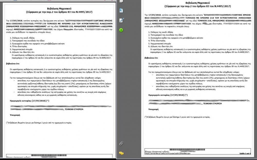 Καλησπέρα ΚΑΝΑ, εγω μιλάω για δήλωση 4495 που δημιουργώ μόνο για έκδοση βεβαίωσης μηχανικού, στην οποία δεν έχουμε να κάνουμε με ανέβασμα αρχείων. Προφανώς, έχει σημασία μόνο για την συμβολαιογράφο, αν και καμιά δεν μου είπε κάτι που τους έδωσα βεβαίωση μηχανικού συνοδευόμενη από 5σέλιδο το οποίο είναι σε "οριστική υπαγωγή" και όχι σε "περαίωση". Όσο για το αν διαφοροποιείται η βεβαίωση, απ' ότι βλεπω σε αυτο που ανεβάζω, και οι δύο βεβαιώσεις είναι ίδιες. Δεξιά είναι όπως βγαίνει σε "περαίωση" και αριστερά όπως ήταν σε "οριστική υπαγωγή" - αν αυτό εννοούσες... Κι εγώ αυτό διαβάζοντας, θεώρησα οτι τέτοια διατύπωση δεν απαιτείται στη τεχνική μου έκθεση, για τη δική μου περίπτωση, αλλά άντε βγάλε άκρη. Ο πωλητής και ο αγοραστής βιάζονται να κάνουν συμβόλαιο, όλα είναι έτοιμα και τους τα έχω δώσει και κολλάμε τώρα αν πρέπει να υπάρχει τέτοια διατύπωση, γιατί κατά τη γνώμη μου είναι πλεονασμός και εκ του περισσού... Και φυσικά, επειδή όλοι θέλουν να κάνουν τη δουλειά τους, ποιός φταίει? "ο κακός μηχανικός" που πείσμωσε και δεν τα γράφει έτσι όπως τα θέλει η συμβολαιογράφος... Θα τους κάνω ό,τι μας έκαναν στην πολεοδομία όταν υπήρχε διχογνωμία: "να κάνουμε ερώτημα στο υπουργείο"! (η μπάλα στην εξέδρα!)