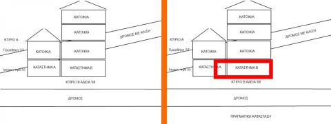 Το κτίριο Α πέρασε με κληρονομιά στον ιδιοκτήτη του κτιρίου Β. Το κτίριο Β είχε κατασκευαστεί σαν ανεξάρτητο, νέο κτίριο, με άδεια για τρεις ορόφους. Έκανα ένα πρόχειρο σκαρίφημα, το ανεβάζω. Αριστερά δείχνω την νόμιμη εκδοχή και δεξιά την πραγματική. -Το κατάστημα Β έχει μπεί στο κατάστημα Α κατα 2 μέτρα, ενώ έχει κλείσει ένα τμήμα από την πίσω πλευρά, απέναντι από αυτήν που δείχνω και έχει γίνει αποθήκη για τις κατοικίες. Αποτέλεσμα είναι ότι το κατάστημα Β έχει σήμερα μικρότερο εμβαδό 65τ.μ <71 τ.μ από την άδεια και ας έχει επεκταθεί στο κατάστημα Α. -Οι είσοδοι των κτιρίων για τις κατοικίες είναι από την πίσω πλευρά επίσης -Στο κτίριο Β, τα στατικά δεν έχουν αλλάξει, με την έννοια ότι υπάρχουν στην θέση τους τα υποστηλώματα και οι δοκοί, μάλιστα έχει γίνει και προσθήκη υποστηλώματος για την ανέγερση του τρίτου ορόφου στο κτίριο Β με άδεια. Το κατάστημα Β είναι αυτό που με ενδιαφέρει για να μπορέσω να δώσω βεβαίωση χώρου. Ελπίζω να βοηθάει το σκαρίφημα και τα στοιχεία που έχω δώσει. Υ.Γ : Ο ιδιοκτήτης επιθυμεί να παραμείνει έτσι η κατάσταση του καταστήματος.