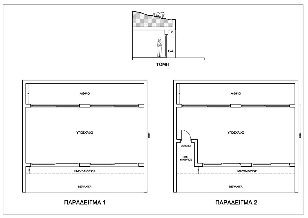 (μεταφέρθηκε στο παρόν θέμα. Pavlos 33) Επιτρέπονται ημιυπαίθριοι χώροι σε υπόσκαφα κτίρια; Η/Χ θα βοηθούσε βιοκλιματικά με τη προστασία της όψης / κτιρίου από καιρικά φαινόμενα όπως και στη βέλτιστη διαμόρφωση της όψης π.χ. πρόσβαση κυρίας εισόδου. Εναλλακτικά, θέτω και αυτό σαν ερώτημα που έχει σχέση: επιτρέπεται στέγαστρο ή πέργκολα επί την ελεύθερης όψης του υπόσκαφου κτιρίου? Παραθέτω ένα απλοποιημένο παράδειγμα διαμόρφωσης Η/ Χ σε υπόσκαφο. Έχω υπόψη διάφορα παραδείγματα στο διαδίκτυο, τα οποία πιθανόν να αποτελούν εξαιρέσεις και όχι απαραίτητα σύμφωνα με τη νομοθεσία.