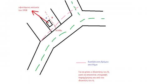 Σε οικισμό με πληθυσμό >2000 και οριακά μικρότερο των 3000 οικόπεδο 490τμ χωρίζεται στο 50% το 1988 λόγω διαφωνίας αδερφών από τους γονείς τους. Στο ένα μισό υπάρχει υφιστάμενη κατοικία κατασκευής 1938, στο άλλο μισό τίποτα. Το οικόπεδο (όλο) έχει πρόσοψη 16,80μ σε κοινότικο δρόμο (ασφαλτοστρωμένο πλάτους 8μ πολύ χαμηλής κυκλοφορίας). Ο δήμος προέβλεψε στο παρελθόν (φαίνεται στα σχέδια του 1988) πιθανή διαπλάτυνση του κοινοτικού δρόμου παίρνοντας από το ένα μισό (που έχει την υφιστάμενη κατοικία) περίπου 4μ και από το άλλο 5-6μ. Ο ιδιοκτήτης του μισού οικοπεδού που δεν υπάρχει τίποτα επιθυμεί ανέγερση και ενημερώθηκε από τον μηχανικό του ότι απαιτείται συμβολαιογραφική πράξη παραχώρησης μέρους του οικοπέδου του, όχι μόνο από τον ίδιο άλλα και από τον αδερφό.Με λίγα λόγια, ο αδερφός πέθανε, το μισό οικόπεδο που έχει την υφιστάμενη κατοικία πέρασε στους νόμιμους κληρονομόνους (ανήψια), ενδεχομένως η διαθήκη να μην έχει ανοιχτεί κλπ (γενικά δεν υπάρχουν σχέσεις των δύο ιδιοκτητών). Γιατί πρέπει να υπογράψουν και οι δύο ιδιοκτήτες εφόσον το αρχικό οικόπεδο έχει χωριστεί; Σημειωτέον ότι και άλλα γειτονικά οικόπεδα που υφίστανται κατασκευές πρέπει να παραχωρήσουν μέρος τους στο δήμο. Δεν πρέπει κι εκείνα, με την ίδια λογική να υπογράψουν για να ανεγείρει ένας γείτονας οικοδομή; Ευχαριστώ Με συγχωρείτε αν πόσταρα σε λάθος κατηγορία αλλά αυτή βλέπω σαν πλησιέστερη. (Υπάρχει συνημμένο αρχείο)