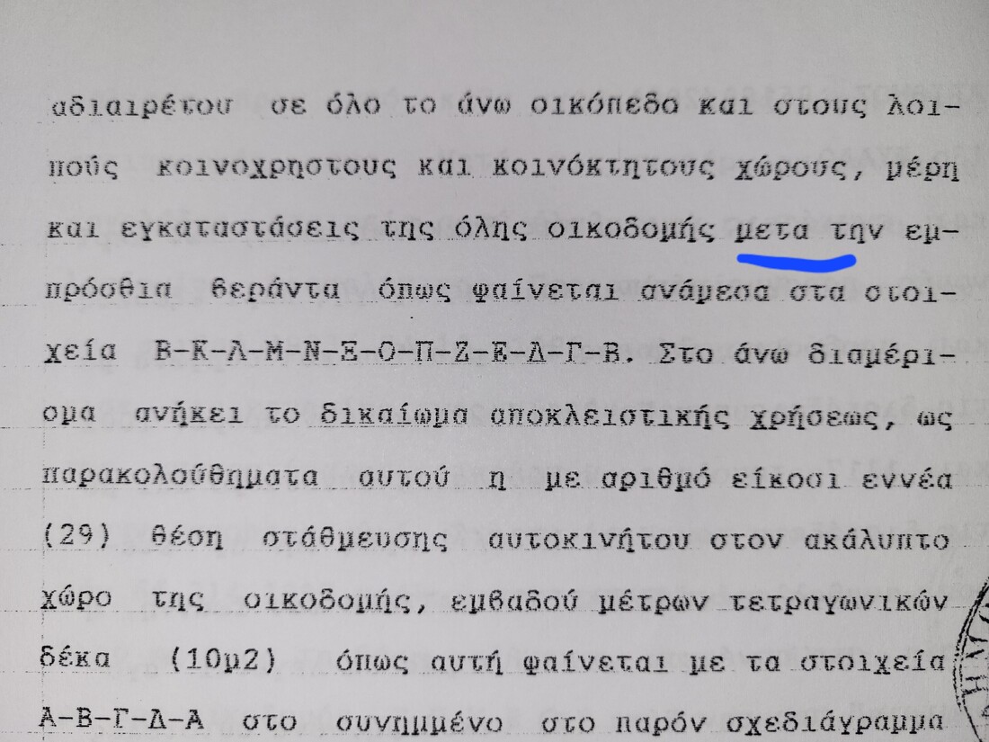 Ευχαριστώ πολύ για την απάντηση. Και στο πρώτο τίτλο κτήσης και στον δικό μου είναι "μετα την" (Επισυναπτω φωτογραφια) και ο δικηγόρος πριν το αγοράσω μου είχε πει ότι πιθανότατα απλά το γράψανε για να κάνουν το χατήρι στην πρώτη ιδιοκτήτρια και θα πρέπει να φαίνεται και στη σύσταση οριζόντιας (στο καταστατικό πολυκατοικίας αναφέρεται κυρίως στην ταράτσα (κοινόχρηστο πρόσβαση, άπλωμα ρούχων, ηλιακους) και στο δωμα καταστημάτων αναφέρει ότι μπορούν να βάλουν συμπιεστές στα 40τμ.) Ουτε στο τιτλο κτησης ούτε στο καταστατικό πολυκατοικίας αναφέρει τα μπαλκόνια των διαμερισμάτων. Στην ΟΑ φαίνεται ότι έχω περιμετρικα (γωνιακο) μπαλκονι 2μετρα αυτό μπορώ να δω κάπου ότι ανήκει σε μενα/στο διαμέρισμα μου?(ίσως στο εργολαβίες συμβόλαιο?) -