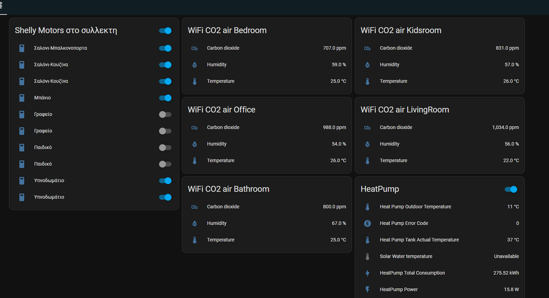 Ευχαριστώ, ναι τον εμαθα τον αισθητηρα της Aqura οτι ειναι απο τους καλυτερους στο ειδος απλα αφου ειχα αγορασει της Shelly xD. Χμ πως βλεπω στο manual της Α/Θ οτι εχει αυτοματη υδραυλικη προσαρμογη xD (υπαρχει μονο ενας κυκλοφορητης εσωτερικα της Α/Θ και κανενας εξωτερικος) Συστημα (Φυσικό/Υλικό): Α/Θ Inventor Matrix 8kW ATMH08S3 Interplast ξηρας δομησης ενδοδαπέδια R&D HVA εναλλακτες 150 (pair με Shelly 2PM για να γινουν smart) (15cm λ=0,030 / 14,4m² Uw =~ 0,80) Shelly 2PM Plus και 2.5PM smart relays [2 outputs/switches per unit] (πισω απο διακοπτες ρολλων, φωτων, στον συλλεκτη και μαζι με το Shelly Addon και DS18B20-με 20μ utp xD- για να παιρνω θερμοκρασίες απο Ηλιακό θερμοσίφωνα) Ηλεκτρικα κινητηρακια για αυτομομία ανα κυκλωμα της Möhlenhoff Αισθητηρας CO2/Temp/Humidity της Moes https://moeshouse.com/products/wifi-3-in-1-co2-monitor?variant=39873257635921 (Tuya) Shelly ανιχνευτες κινησης, Shelly μαγνητικές παγίδες πορτων/παραθυρων Mini-PC Intel N5095 16GB RAM 512GB (Τρεχει λειτουργικο Home Assistant OS) Λογισμικο: Home Assistant στο οποιο κανεις Integration ολα τα ζαρζαβατικα σου και τα ελεχγεις απο εκει Μπορεις να συνδεσεις Apple HomeKit, Aqara, Tuya, Shelly κτλ κτλ Bluetooth, Wifi, Zigbee mqtt και να τα ελεχεις απο το UI του Home assistant server (ειναι ιστοσελιδα οποτε μπαινεις με υπολογιστη, κινητο, tablet χωρις downloads αν και εχει και την Apple/Android εφαρμογη) Το Matter ειναι semi integrated (εχει καποια bugs μιας και ειναι νεο integration) στο Home Assistant https://www.home-assistant.io/integrations/matter/ Το HomeKit ειναι fully integrated https://www.home-assistant.io/integrations/homekit/ Με το Home assistant (Open Source) βασικα αφου εισαγεις/συνδεσεις ολες σου της smart συσκευες HomeKit, Tuya, Aqara, NanoLeaf, Α/Θ μπορεις να της ελεγχεις απο ενα σημειο (Home assisant) και να στελνεις εντολές είτε να δημιουργεις αυτοματισμους. Πχ αν παει 00:00ΑΜ + Εξωτ Θερμοκρασια της Α/Θ ειναι 20 Βαθμους τοτε ενεργοποιησε το switch 0 (DOWN) των shelly των ρολλων, if Moes Co2 Bedroom > 1000 then HVA[1,2,3,4,5] open turbo). Η να δημιουργησεις script και με 1 κουμπι να αναβουν στο turbo οι Εναλλακτες Θερμοτητας Στο manual σχετικα με τον κυκλοφορητη εχει αυτο Καταναλωσεις Α/Θ αν και δεν νομιζω να μπορει να βγει συμπερασμα αν ρυθμιζει αυτοματα τον κυκλοφορητη