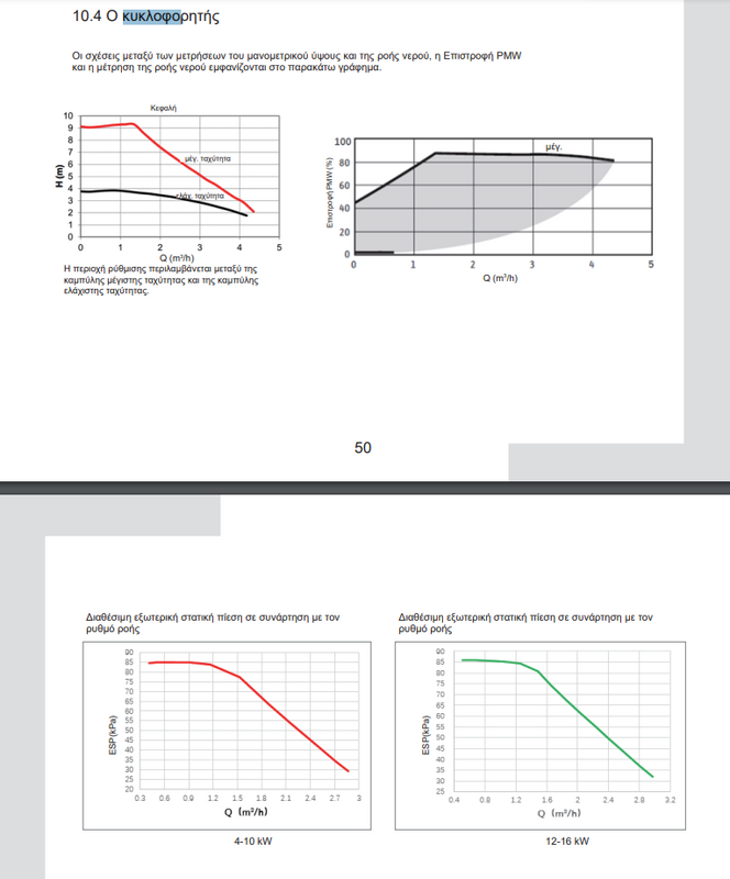Ανάλογα με τη διαφορα θερμοκρασίας νερων (επιθυμητη, εξοδου, εισοδου) η ροή νερου διαφερει αυτο σημαινει οτι υπαρχει υδραυλικη προσαρμογη? (αυτοματη) Οταν η θερμοκρασιες νερου ειναι στο επιθυμητο και δουλευει μονο ο κυκλοφορητης ροη νερου ~ 0,67m³/h Αυξησα την επιθυμητη θερμοκρασία νερού 2 βαθμους η ροη νερου αρχισε να αυξανει και οταν ξεκινησε και ο κομπρεσορας (αν το λεω καλα) η ροη ηταν 1,18m³/h σταθερα (και διαφερετικη θερμοκρασια νερων εξοδου/εισοδου φυσικα) οταν αυξησα την επιθυμητη θερμοκρασια 10 βαθμους η ροη νερου αυξηθηκε στα 1,33m³/h