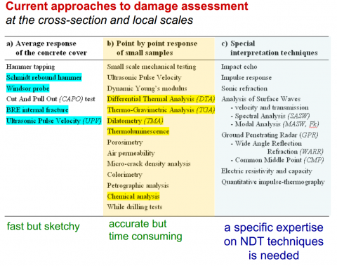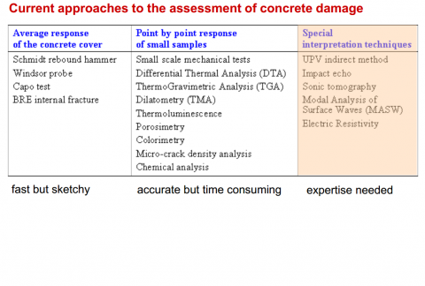 Με λίγα λόγια: 1.Υπέρηχος (ISO 834 fire) 2.Δοκίμιο (πυρήνας), τεμαχισμός και έλεγχος σε Πετρογραφική Ανάλυση Young Modulus. Χρωμομέτρηση (γίνεται και με φηφιακή κάμερα) 3.Συλλογή σκόνης απο τρύπημα σε ειδικό σωλήνα, έλεγχος σε ασβεστοποίηση (30 δεύτερα η διάρκεια). 4.Θερμογραφικός έλεγχος. 5.Κρουσιμέτρηση σε περίπτωση που δεν είναι δυνατή η εφαρμογή ΜΚΕ για τον εντοπισμό κενών ή φωλέων. 6.Εξόλκευση ήλων ή μέθοδος διείσδυσης. ( Σε συνδυασμό με έλεγχο ασβεστοποίησης απο συλλογή σκόνης για εκ νέου βαθμονόμιση) 7.Εφαρμογή γεωραντάρ για τον εντοπισμό ανωμαλιών στον ιστό. 8.Έλεγχος χάλυβα με τη μέθοδο Leeb ή εργαστηριακά.