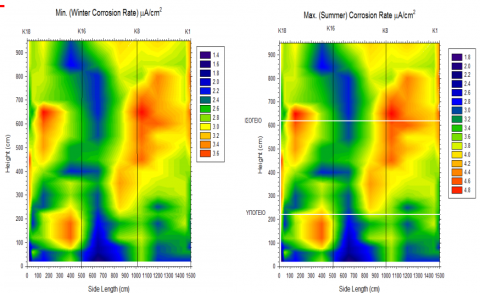 για κάποιον λόγο έγινε 2 φορές το πόστ. Το βάζω σε ξεχωριστό ποστ για να μη μπερδευτεί με τα προηγούμενα και συγγνώμη για την κατάχρηση Χρήστο ,σ'αυτά που ανέβασες τελευταία απο τις μετρήσεις στην Ιθάκη χρησιμοποίησες όλες τις παραμέτρους επιρροής.Δηλαδή έλαβες υπόψη τους εξής παράγοντες: Vcorr = f(T,Fo2,RH,Ccl,pH,R,Fgalv,Foxide) T = θερμοκρασία Fo2 = Παροχή οξυγόνου στο νερό των πόρων που είναι σε επαφή σε με τη καθοδική περιοχή. RH = σχετική υγρασία, αν και δεν είναι δόκιμος ο όρος. R = Ηλεκτρική αντίσταση σκυροδέματος. Fgalv = Γαλβανική αλληλεπίδραση Foxide = Επιρροή του σχηματισμού σκουριάς στο ρυθμό διάβρωσης( αυτό δεν είμαι σίγουρος αν το έλαβες)