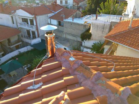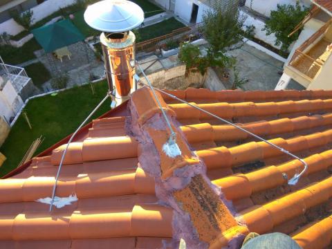 4. το καπελο ειναι στερεωμενο με αφρο πολυουρεθανης. μετα την διογκωση ειχε φτασει μεχρι την τρυπα...... συνολικο υψος 9m. τα 4 πανω μετρα εχουν μονο αυτες τις ντιζες για στιριξη. η καμιναδα στεκεται κυριως απο φιλοτιμο......... ο ιδιοκτιτης ομως πληρωσε διπλη μονομενη απο τις καλες μαρκες τις αγορας.