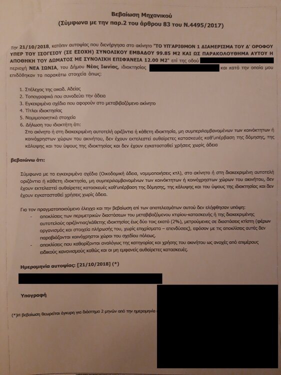 Δηλωμένα τετραγωνικά σε συμβολαίο μαζί με Βεράντεςkostasinjeyan replied to kostasinjeyan's θέμα in Θέματα Ιδιωτών Από ότι βλέπω όντως η γονική παροχή του 2018 κάνει αναφορά σε βεβαίωση μηχανικού αλλά μόνο ως προς το ότι δεν έχουν γινει αυθαίρετες κατασκευές. Φαντάζομαι ότι εν λόγο μηχανικός δεν μέτρησε ποτέ. Έχω την εντύπωση δε ότι δεν πρέπει να πήγε και ποτέ στο διαμέρισμα. Αυτό θα το επιβεβαιώσω αύριο, μιας και η συγκεκριμένη γονική παροχή έγινε από τον παππού της συζύγου μου στην μητέρα της και δεν έχω πλήρη γνώση της διαδικασίας που ακολούθησαν.
