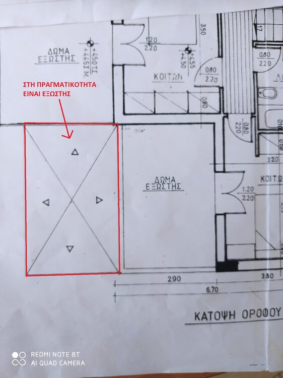 Καλησπέρα DimitriGM και ευχαριστώ για την άμεση ανταπόκριση σου. Το θέμα σε αυτή την περίπτωση είναι ότι ο μηχανικός που συνέταξε το Δ.Κάλυψης αντιμετωπίζει το σύμπλεγμα μεζονετών ώς ένα κτίριο ("ΚΤΙΡΙΟ Γ") επομένως δεν "μοιράζει" το Σ.Δ για κάθε αυτοτελή μεζονέτα για να έχω μια πιο συγκεκριμένη εικόνα. Απλά αναφέρει όλους τους συντελεστές αντιμετωπίζοντας τα ως ένα κτίριο και σαν ένα οικόπεδο. Σημειώνεται πως και στη σύσταση έτσι αναφέρεται. Το μόνο που αναφέρει η σύσταση για κάθε μεζονέτα είναι τον αποκλειστικό χώρο που αντιστοιχεί σε κάθε μία και τα χιλιοστά επί του όλου οικοπέδου της κάθε μιας. Επίσης τονίζει πως το μόνο κοινόχρηστο αυτών είναι ο βόθρος. Επομένως: - Δεν φαίνεται σε ποιας κάθετης ΣΔ υπολογίσθηκε. Η κάθε κάθετη ιδιοκτησία αποτελείται από 1ο, ισόγειο και υπόγειο. Δεν πατάει ο όροφος πάνω από το μπάνιο, ούτε επεκτείνεται το υπόγειο από κάτω του. Αφορά μόνο το ισόγειο. - Στην υπάρχουσα κατάσταση των καθέτων ιδιοκτησιών, πρακτικά, ο "1" έχει μπέι (μπάνιο) στα όρια αποκλειστικής χρήσης του "2". - Ο μηχανικός του "2" τακτοποίησε το μπάνιο του "1" ως Υ.Δ και Υ.Κ σε ισόγειο χώρο. Όταν μιλήσαμε και τον ρώτησα γτ το τακτοποίησε μου είπε επειδή ανήκει μέσα στα όρια της καθέτου του "2". Με λίγα λόγια, από αυτά που καταλαβαίνω ο "2" πλήρωσε το πρόστιμο του "1" (του πελάτη μου). Θα μπορούσα να επικαλεστώ ότι έχει πληρωθεί από άλλο Α/Α άραγε? - Όσον αφορά το κοινόχρηστο βόθρο, κοίταξα το άρθρο 98 άλλα πάλι δεν μπορώ να καταλάβω πως να το αντιμετωπίσω. Στις φώτο (δεξιό τμήμα) φαίνεται το couranglais και το μπάνιο. Κάθε βοήθεια σας θα είναι πολύ χρήσιμη και συγνώμη αν σας κούρασα, αλλά όπως είπες και συ DimitrisGM είναι μπλέξιμο.