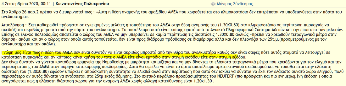 1. Θεωρώ πως το δεύτερο σχέδιο έχει τις εξής δυο δυσκολίες: 1) Μου φαίνεται πρακτικά δύσκολο (έως αδύνατο - δεν είμαι σίγουρος - αυτό θα έπρεπε να το πει κάποιο ΑΜΕΑ) για ένα ΑΜΕΑ να κάνει τη 'μανούβρα' ώστε να 'παρκάρει' σε αυτή τη θέση. 2) Εάν είναι πράγματι δυνατό το να κάνει ένα ΑΜΕΑ τη μανούβρα και να παρκάρει σε αυτή τη θέση, τότε είναι σημαντικό και το να ξέρουμε πόσο εύκολα και σε πόσο χρόνο μπορεί να το κάνει αυτό, γιατί μέχρι να παρκάρει εκεί παρεμποδίζει την έξοδο των ενοίκων του διπλανού διαμερίσματος και τη χρήση του ανελκυστήρα (ο οποίος καλώς ή κακώς μπορεί να χρησιμοποιηθεί), επειδή και η πόρτα του διαμερίσματος και η πόρτα του ανελκυστήρα είναι στο χώρο του μανουβραρίσματος. Επειδή αυτή η θέση αναμονής του ΑΜΕΑ είναι για να χρησιμοποιηθεί σε περίπτωση έκτακτης ανάγκης, στην οποία επικρατεί πανικός, και οι ένοικοι του διαμερίσματος θα θέλουν να τρέξουν προς τα έξω και κάποιοι (καλώς ή κακώς) θα προσπαθούν να πάρουν τον ανελκυστήρα, θα είναι αρκετά ενοχλητικό και για τους μεν και για το ΑΜΕΑ να υπάρχει αυτή η αλληλοπαρεμπόδιση. Επίσης, αφού όπως λέει η ΥΔΟΜ ο ανελκυστήρας δεν είναι για να χρησιμοποιείται σε περιπτώσεις κινδύνου, θα μπορούσαμε να βάζουμε τη θέση αναμονής του ΑΜΕΑ ακριβώς μποροστά στην πόρτα του ανελκυστήρα; (Δεδομένου ότι δεν παρεμποδίζεται η όδευση προς τις σκάλες). Η απάντηση μάλλον είναι πως ναι, γιατί έτσι γράφει και ο Κανονισμός Πυροπροστασίας Κτιρίων (άρθρο 3 - ΦΕΚ 2018): Πάντως υπάρχει και η αντίθετη άποψη (δικαιολογημένα θεωρώ), όπως φαίνεται και στο παρακάτω σχόλιο. http://www.opengov.gr/minenv/?p=10817 Άλλωστε η χρήση του ανελκυστήρα σε περίπτωση πυρκαγιάς δεν είναι ότι 'απαγορεύεται' αλλά ότι 'δεν συνίσταται'. Ο Κανονισμός Πυροπροστασίας γράφει πως αυτό που απαγορεύεται είναι η χρήση του ανελκυστήρα ως 'όδευση διαφυγής' κατά τον σχεδιασμό (άρθρο 5 - ΦΕΚ 2018 - δες απόσπασμα παρακάτω), αλλά η πραγματική χρήση του ανελκυστήρα από κάποιον δεν απαγορεύεται από τον νόμο, δηλαδή δεν διώκεται ποινικά κάποιος εάν χρησιμοποιήσει τον ανελκυστήρα εν ώρα πυρκαγιάς. Που σημαίνει ότι κάποιος διατηρεί το δικαίωμα να χρησιμοποιήσει τον ανελκυστήρα ακόμα και σε περίπτωση φωτιάς. Δεν μπορεί λοιπόν ένα ΑΜΕΑ να του παρεμποδίζει αυτό το δικαίωμα. Αυτό βλέπω εγώ με τα λίγα νομικά που καταλαβαίνω.