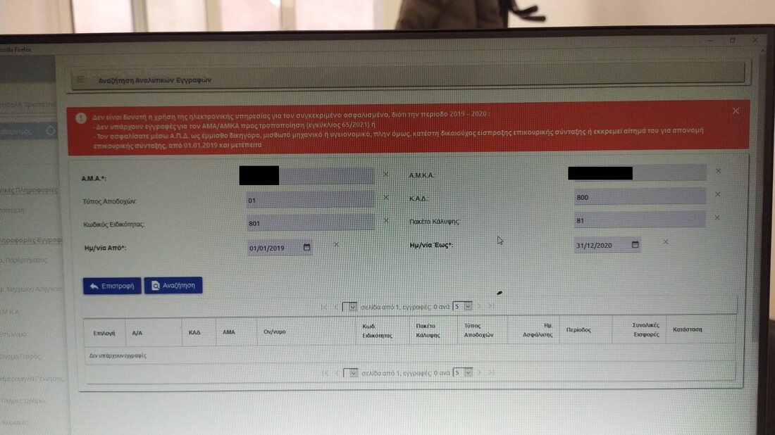 Παιδιά καλησπέρα, Μετά απο αρκετή πίεση στον λογιστή της εταιρείας που εργαζόμουν με μπλοκάκι και σύμφωνα με το άρθρο 39 ασφαλιζόμουν σας μισθωτός μηχανικός την περίοδο 2019-2020, στην προσπάθεια του να τροποποιήσει τις τότε ΑΠΔ του εμφανίστηκε το μήνυμα της εικόνας. Ψάχνοντας την εγκύκλιο 65/2021, που καθορίζει τις επιστροφές εισφορών, βλέπω πως δεν περιλαμβάνεται ο κωδικός ειδικότητας 000801, τον οποίο χρησιμοποιούσε ο λογιστής για τις ΑΠΔ. Όμως ο συγκεκριμένος κωδικός περιλαμβάνει εισφορές για επικουρική και Πρόνοια, οπότε δεν καταβαίνω γιατί δεν επιτρέπεται η αναδρομική τροποποίηση των ΑΠΔ. Έχει αντιμετωπίσει κάποιος άλλος θέμα με τον συγκεκριμένο κωδικό ειδικότητας 000801; Ή καποια άλλη ιδέα τι μπορεί να φταίει και με ποιόν μπορώ να μιλήσω; Ευχαριστώ πολύ -