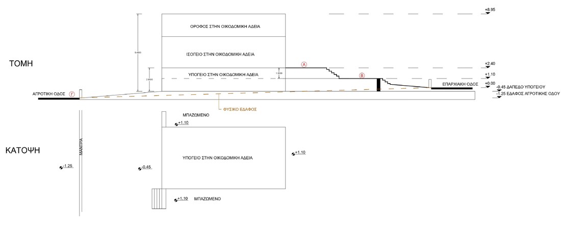 Καλησπέρα συνάδελφοι. Έχω αγροτεμάχιο εκτός σχεδίου όπου χτίστηκε με άδεια διώροφη οικοδομή με υπόγειο. Το αγροτεμάχιο συνορεύει με δύο οδούς (αγροτική και επαρχιακή). Σχετικά με τις αποστάσεις δεν έχω θέμα. Με έχουν προβληματίσει τα ύψη. Σας επισυνάπτω την τομή της υπάρχουσας κατάστασης. Από τη μεριά της αγροτικής οδού ολόκληρη η όψη του υπογείου είναι πάνω από το έδαφος. Από τη μεριά της επαρχιακής οδού έχουν γίνει εργασίες και ο χώρος έχει διαμορφωθεί πιο ψηλά. Όπως φαίνεται στην κάτοψη ακριβώς στην ευθεία της όψης του υπογείου προς την αγροτική οδό έχει κατασκευαστεί μάντρα και τελειώνει το μπαζωμένο τμήμα. Η ερώτησή μου είναι η εξής: το υπόγειο δεν έχει μετρήσει στην δόμηση καθώς θα έπρεπε να έχει κατασκευαστεί σε άλλη στάθμη βάσει της άδειας και να προεξείχε από το έδαφος 1.00 μέτρο. Σύμφωνα με τον ΓΟΚ 85 που αφορά τις τακτοποιήσεις με τον ν.4495/17 το υπόγειου μπορεί να εκτείνεται μέχρι και 1.50 μέτρο από το έδαφος. Στην συγκεκριμένη περίπτωση ποιο θα πρέπει να θεωρηθεί σαν διαμορφωμένο έδαφος? To A, το Β, το Γ, η επαρχιακή οδός ή κάποιο άλλο? Όποιος μπορεί να βοηθήσει θα ήμουν ευγνώμων. Ευχαριστώ πολύ