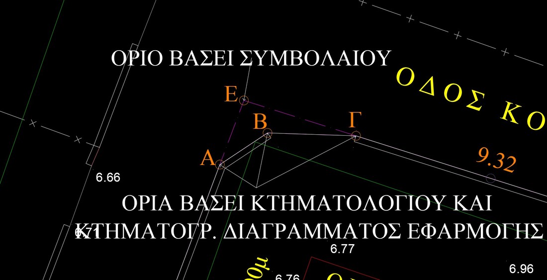 Καλησπέρα σας. Έχω μια απορία. Κάνω τοπογραφικό για γονική παροχή σε περιοχή με ΜΗ κυρωμένη πράξη εφαρμογής. Στο συμβόλαιο το όριο της ιδιοκτησίας είναι η τομή των ευθειών των μαντρότοιχων (σημείο Ε). Βάσει κτηματογραφικού διαγράμματος εφαρμογής και κτηματολογίου και υφιστάμενης κατάστασης η ιδιοκτησία βρίσκεται κανονικά βάσει των υλοποιημένων ορίων (σημεία Α,Β,Γ). Εν τέλει στο τοπογραφικό μου, ποιά όρια θα εφαρμόσω;; Λογικά εφόσον η Π.Ε δεν έχει κυρωθεί, δεν πρέπει να πάω βάσει συμβολαίου; -