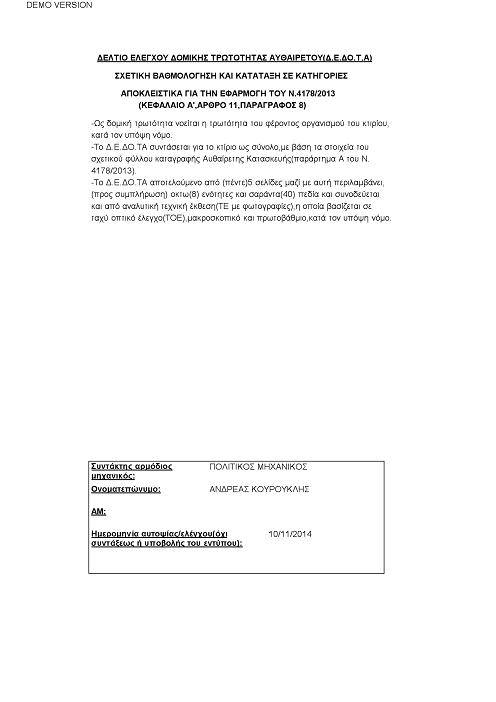 Πρόκειται για ένα πρόγραμμα το οποίο εισάγοντας όλα τα απαραίτητα δεδομένα σύμφωνα με το ΦΕΚ 405Β/20-2-2014 υπολογίζει Αρχική και Τελική Δομική τρωτότητα του κτιρίου και παράγει όλα τα σχετικά εντυπα του ΔΕΔΟΤΑ και τον σχετικό ΠΙΝΑΚΑ(ΑΔΒ).Ολοι οι υπολογισμοί γίνονται αυτόματα με το πάτημα ενός κουμπιού και ταυτοχρονα δημιουργούνται έτοιμες προς εκτύπωση οι 5 σελίδες(40 πεδία) του ΔΕΔΟΤΑ.Οι επιλογές εκτύπωσης είναι πολλές(απευθείας εκτύπωση,εξαγωγή σε word,excel,jpeg αλλά και σε pdf για άμεση αποστολή στο σύστημα του ΤΕΕ). Επίσης υπάρχει η δυνατότητα χωρίς να εισαχθούν τα στοιχεία των ενοτήτων Α έως ΣΤ (με κατευθειαν εισαγωγή στοιχείων από το κεντρικό μενού) να υπολογιστει η ΑΔΒ&ΤΒ και ο ΠΙΝΑΚΑΣ(ΑΔΒ). Στην τελευταία έκδοση(1.6) προστέθηκε η δυνατότητα δημιουργίας-εκτύπωσης της τεχνικής έκθεσης που απαιτεί το ανωτέρω ΦΕΚ. Στην έκδοση 1.71 προστέθηκαν τα έντυπα του ΔΕΔΟΤΑ4178/2013 όπως ακριβώς περιλαμβάνονται στο ΦΕΚ 405/Β/20-2-2014. Στην έκδοση 1.77s έγιναν βελτιώσεις&προσθήκες στο μενού του προγράμματος. Επίσης στο εξώφυλλο και στην τεχνική έκθεση του ΔΕΔΟΤΑ προστέθηκε η δυνατότητα εμφανισης υδατογραφήματος με τα στοιχεία του μηχανικού. Στην έκδοση 1.80s προστέθηκε το εργαλείο tooltip για την εμφάνιση πληροφοριών κατά την καταχώρηση στα πεδία ,που βοηθούν στην σωστή εισαγωγή των δεδομένων στο πρόγραμμα. Με την έκδοση 1.88s ειναι δυνατή η αποθήκευση των δεδομένων που εισάγονται στο ΔΕΔΟΤΑ σε αρχείο κειμένου(txt) το οποίο ειναι αναγνώσιμο απο οποιόνδήποτε editor.Ετσι κάθε συνάδελφος μπορεί πρίν φορτώσει την μελέτη στο πρόγραμμα να κάνει προεπισκόπηση στα δεδομένα εισαγωγής αλλά και να δημιουργήσει αρχεία με όλες τις μελέτες του. Στην έκδοση 1.95 βελτιώθηκε η προεπισκόπηση αλλά και η εκτύπωση του Πίνακα ΑΔΒ έτσι ώστε να φαίνονται τα επιλεγμένα πεδία του πίνακα βάσει των οποίων γίνεται ο υπολογισμός της ΑΔΒ.(η βελτίωση έχει γίνει μέχρι και την κατηγορία Φέρουσα Τοιχοποία ΤΔ-στην επόμενη έκδοση θα γινει η βελτίωση και στις υπόλοιπες κατηγορίες-). Στην έκδοση 2.07 έχει γίνει η πλήρης βελτίωση στην προεπισκόπηση και εκτύπωση του Πίνακα ΑΔΒ ώστε να φαίνονται τα επιλεγμένα πεδία βάσει των οποίων γίνεται ο υπολογισμός της ΑΔΒ για όλες τις κατηγορίες δομικών τύπων κτιρίου. Στην έκδοση 2.11 είναι δυνατή η συγχώνευση των επιμέρους αρχείων pdf που παράγει το πρόγραμμα σε ένα ενιαίο για υποβολή στο σύστημα του ΤΕΕ(Από το menu:"Βοήθεια" επιλέγετε :"Συγχώνευση αρχείων pdf"). Στην έκδοση 2.25 προστέθηκε ο αναλυτικός πίνακας έντασης λειτουργίας του ΔΕΔΟΤΑ4178 και σχετικό κουμπί στο μενού του προγράμματος για εισαγωγή των τιμών. Η έκδοση 2.33 έχει την δυνατότητα της αυτόματης δημιουργίας-εκτύπωσης-εξαγωγής σε διαφορους τύπους αρχείων της Τεχνικής Εκθεσης που απαιτείται για το ΔΕΔΟΤΑ όπως απαιτεί ο νόμος 4178/2013 και το σχετικό ΦΕΚ . Η δημιουργία της τεχνικής έκθεσης είναι πλήρως αυτοματοποιημένη και γίνεται από τα στοιχεία που έχουν εισαχθεί στις Ενότητες Α-Β-Γ-Δ-Ε του ΔΕΔΟΤΑ.Υπάρχει όμως και η δυνατότητα εισαγωγής τεχνικής έκθεσης όχι αυτόματα αλλά κατ΄επιλογή του μηχανικού. Η έκδοση 2.45 έχει την δυνατότητα προβολής των συντελεστών τρωτότητας κατά την εισαγωγή των δεδομένων ώστε να υπάρχει άμεση ενημέρωση για την τιμή της ΑΔΒ του κτιρίου.Επίσης βελτιώθηκε το κεντρικό μενού Η τελευταία έκδοση 2.55 περιλαμβάνει τον Πίνακα Εντασης Λειτουργίας του ΔΕΔΟΤΑ σε αρχείο μορφής pdf και excel έτσι ώστε(ο πίνακας) να μπο