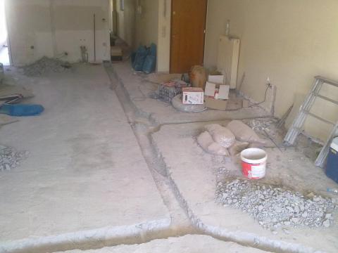 Γειά σας! Προσπαθώ να κάνω μια ανακαίνιση σε ένα διαμέρισμα που βρίσκεται στον τρίτο και τελευταίο όροφο πολυκατοικίας που κατασκευάστηκε περί το 1993. Το ερώτημα είναι με τι και πως θα γεμίσω τα "χαντάκια" που φαίνονται στην συνημμένη φωτογραφία και τα οποία είναι πλέον κάπως έτσι , μετά την προσθήκη από τον ηλεκτρολόγο κάποιων σωληνώσεων. Η παλιά τσιμεντικονία είναι περί τα 9 cm (5 cm κατι σαν αφρομπετό και 4 cm τσιμεντοκονίαμα). Επιπλέον στο κάτω μέρος -στο επίπεδο του αφρομπετον - περνάνε σωληνώσεις καλοριφερ που προφανώς συστολοδιαστέλλονται έντονα . Να σημειώσω ότι δυστυχώς είχα αυτό το ατύχημα, το οποίο επισκευάστηκε , με αντικατάσταση του βλαμμένου τμήματος της χαλκοσωλήνας . Πριν το θάψω με τον τρόπο που θα μου πείτε και πέρα από μια δοκιμή που έκανα με το καλοριφερ να δουλεύει καμμιά ώρα και την μόνωση που είναι να της βάλω , αν υπάρχει κάποια καλή ιδέα καλύτερης επισκευής με καμμιά πατέντα (πχ να βάλω διπλή σωλήνα τοπικά..λύση "πουκάμισο" μου την είπαν") πείτε τη πριν το εξαφανίσουμε. Άρα το επείγον ερώτημά μου είναι , με ποιο τρόπο να γεμίσω τα χαντάκια.Κάποιος φίλος είπε φτιάξε ένα μείγμα άμμο-τσιμέντο χωρίς να τσιγγουνευτείς το τσιμέντο και θάψε...ο υδραυλικός μου λέει ρίξε τρεις πόντους άμμο τσιμέντου να καλύψεις τις σωλήνες, βρεξε να κάτσει , και απο πάνω αμμο-τσιμέντο..στο μεταξύ βλέπω ότι υπάρχουν υλικά για πρόσφυση νέου και παλιού τμήματος τσιμεντοκονίας..πρόσθετα τύπου Revinex . Περιμένω τη βοήθειά σας και ευχαριστώ προκαταβολικά! υ.γ.Στο τέλος θα κολληθεί προγυαλισμένο πάτωμα αφού με κάποια ρητίνη γίνει σκλήρυνση και βελτίωση των 4 cm της τσιμεντοκονίας που βρίσκεται πάνω απ'το αφρομπετον.