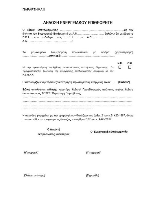 (Υποβάλλω την ερώτηση ως Μηχανικός Δομικών Έργων και Ενεργειακός επιθεωρητής Α' Τάξης. Νέος Μηχανικός στο επάγγελμα, Τεχνολόγος με επιτυχή παρακολούθηση του σεμιναρίου ενεργειακών επιθεωρητών πριν επταετίας! Αποφάσισα μετά από πολλή μεγάλη αποχή από το επάγγελμα να ασχοληθώ. Ήρθε μία δουλειά στο νέο μου χώρο σχετικά με νέα εγκατάσταση Φυσικού Αερίου. Είμαι γενικά στα πρώτα στάδια και θα χρειαστώ απάντηση από έμπειρο συνάδελφο που έχει τη θέληση να βοηθήσει να εγκλιματιστώ) Συνάδελφοι χαίρετε, Ο πελάτης ζήτησε να του συμπληρώσω την Υπεύθυνη Δήλωση για την ΕΔΑ Θεσσαλονίκης, ώστε να αιτηθεί νέα σύνδεση Φ/Α σε διαμέρισμα 3ου ορόφου για να τοποθετήσει αυτόνομο λέβητα που θα χρησιμοποιείται για Θέρμανση 2 θερμικών ζωνών και θα παράγει ΖΝΧ. Κατέβασα το σχετικό αρχείο από την ΕΔΑ με την υπεύθυνη δήλωση του μηχανικού - επιθεωρητή και το έγγραφο προς ονομαστική υπογραφή της οικοδομής όπου θα τεθεί να συμπληρωθεί μετά από σχετική συνέλευση των ενοίκων της εκεί πολυκατοικίας. ΕΡΩΤΗΣΗ: Για να υπογραφεί αυτή η Υπεύθυνη Δήλωση από τον Επιθεωρητή απαιτείται η εφαρμογή μελέτης με το ΤΕΕ-ΚΕΝΑΚ για την έκδοση του εντύπου της Έκθεσης Ενεργειακής Επιθεώρησης Συστημάτων Θέρμανσης; ή απλώς συμπληρώνω την εξοικονόμηση ετήσιας κατανάλωσης στο σχετικό πεδίο από την ενδεικτική και κατά προσέγγιση τιμή της ? (επισυνάπτω την αίτηση) . Δε ξερω για αυτό και ρωτάω ώστε να μάθω τι να εφαρμόσω, και πως να το κοστολογήσω όλο αυτό. (άλλο η υπογραφή και η σφραγίδα και άλλο ολόκληρη μελέτη). Ευχαριστώ για όλες τις πιθανές απαντήσεις.