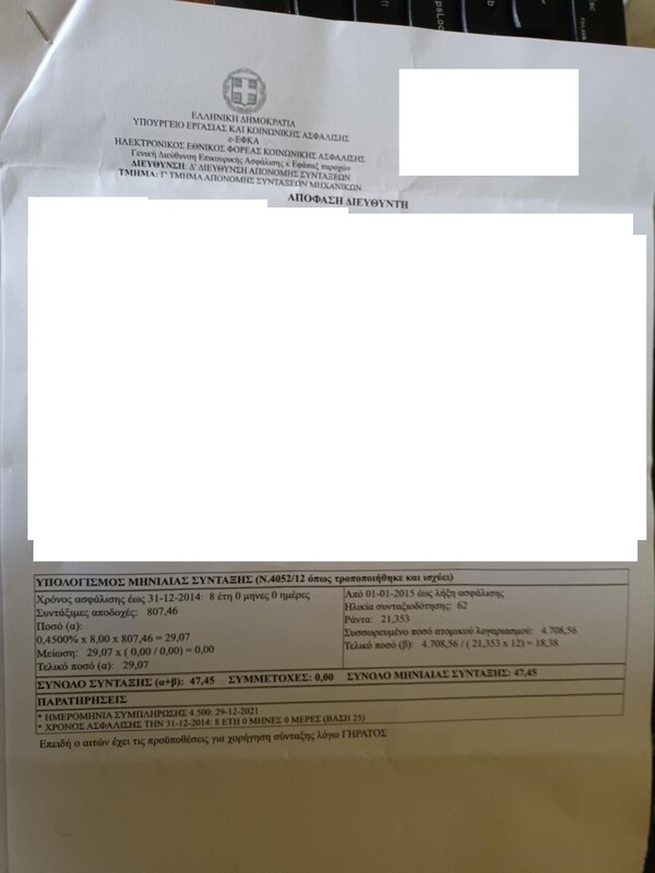 Πρόσφατα νέα και καταχρηστική πρακτική ΕΦΚΑ για παρακράτηση οφειλών.. Data : Ασφάλιση ΤΣΜΕΔΕ σαν ελ. επαγγ. : 36χρ και 4 μ. (1983-2019) + 3χρ. 8μ. εξαγορά Αίτηση για κύρια σύνταξη (με οφειλές) : Σεπτέμβριος 2021 Απόφαση κύριας σύνταξης : Μάιος 2023 (20 μήνες) --> Ποσό : 1.073 € Αίτηση για επικουρική και ΕΦΑΠΑΞ (με οφειλές) : Ιούνιος 2023 Απόφαση ΕΦΑΠΑΞ (από Αθήνα) : Σεπτέμβριος 2024 (16 μήνες) --> Ποσό : 7.580 € Απόφαση για επικουρική σύνταξη (από Θεσσαλονίκη !!) : ANAMENETAI !!!! Καταχρηστική πρακτική ΕΦΚΑ : Η Γ΄ Δ/νση του ΕΦΚΑ στην Αθήνα, κατάφερε να βγάλει απόφαση για το ΕΦΑΠΑΞ σε 16 μήνες (!) αλλά παρακράτησε ΟΛΕΣ τις ανεξόφλητες εισφορές μου για ΕΠΙΚΟΥΡΙΚΉ ΑΣΦΑΛΙΣΗ από το ΕΦΑΠΑΞ (!!) δηλαδή συνολικά 2.934,40 €, ενώ ακόμα εκκρεμεί η Αίτησή μου (16 μήνες) για την Επικουρική Σύνταξη που δικαιούμαι από τον Οκτώβριο 2021 (η αίτηση υποβλήθηκε στην Γ΄ Δ/νση ΕΦΚΑ της Θεσσαλονίκης...άλλο τρελό αυτό, επειδή εκεί λέει υπάγονται τα Γιάννενα για το επικουρικό..!). Σε ένα πρόσφατο Email μου, που επιτέλους απάντησαν, με ενημέρωσαν ότι για να ασχοληθούν με την αίτησή μου, αναμένουν τον έλεγχο ασφάλισης και οφειλών από το αρμόδιο τμήμα Ασφαλιστικού Ιστορικού, τον οποίο έλεγχο έχουν ζητήσει από τον ΙΑΝΟΥΑΡΙΟ 2024..! Το τρελό είναι ότι όλα αυτά τα στοιχεία Ασφάλισης και Οφειλών που αναμένουν, υπάρχουν αναλυτικότατα στην απόφαση για το ΕΦΑΠΑΞ..! Τα παραπάνω τα έγραψα περισσότερο για ενημέρωση, για το τι να περιμένουν οι νεώτεροι... Πάντως, αν πήρε κανείς πρόσφατα επικουρική σύνταξη με παραπλήσια δεδομένα, θα ήθελα να μάθω τι ύψους ήταν...50€ ή παραπάνω ;