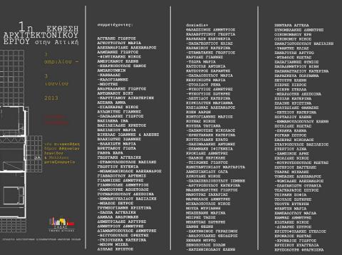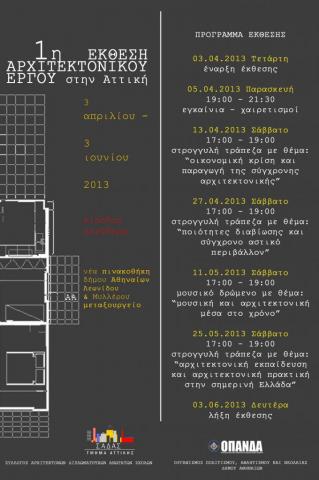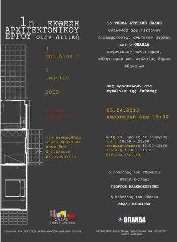 Το Τμήμα Αττικής του Συλλόγου Διπλωματούχων Ανωτάτων Σχολών-ΠΕΑ, με στόχο την προβολή του αρχιτεκτονικού έργου των μελών του, σε συνδιοργάνωση με τον ΟΠΑΝΔΑ - Οργανισμό Πολιτισμού Αθλητισμού & Νεολαίας του Δήμου Αθηναίων- διοργανώνει την: 1η ΕΚΘΕΣΗ ΑΡΧΙΤΕΚΤΟΝΙΚΟΥ ΕΡΓΟΥ, στην Αθήνα: 3 Απριλίου-3 Ιουνίου 2013 στη Νέα Πινακοθήκη του Δήμου Αθηναίων, Λεωνίδου και Μυλλέρου, στο Μεταξουργείο. Στην έκθεση συμμετέχουν αρχιτέκτονες μέλη του, με αρχιτεκτονικά έργα, μελέτες ή επεμβάσεις, στο δημόσιο και ιδιωτικό χώρο, από την ευρύτερη διοικητική περιοχή της Αττικής. Στα πλαίσια της έκθεσης θα κυκλοφορεί Κατάλογος των έργων. View attachment: 1.jpg View attachment: 2.jpg View attachment: 3.jpg