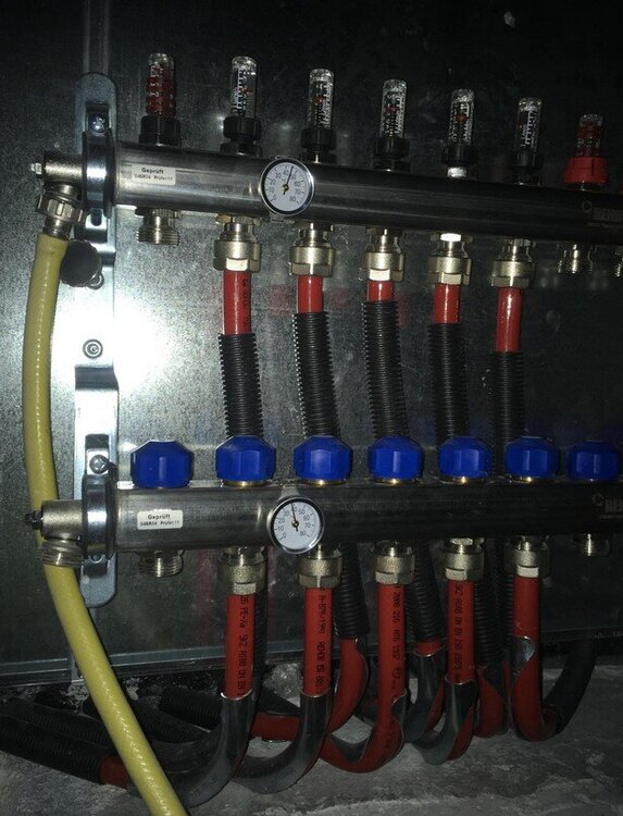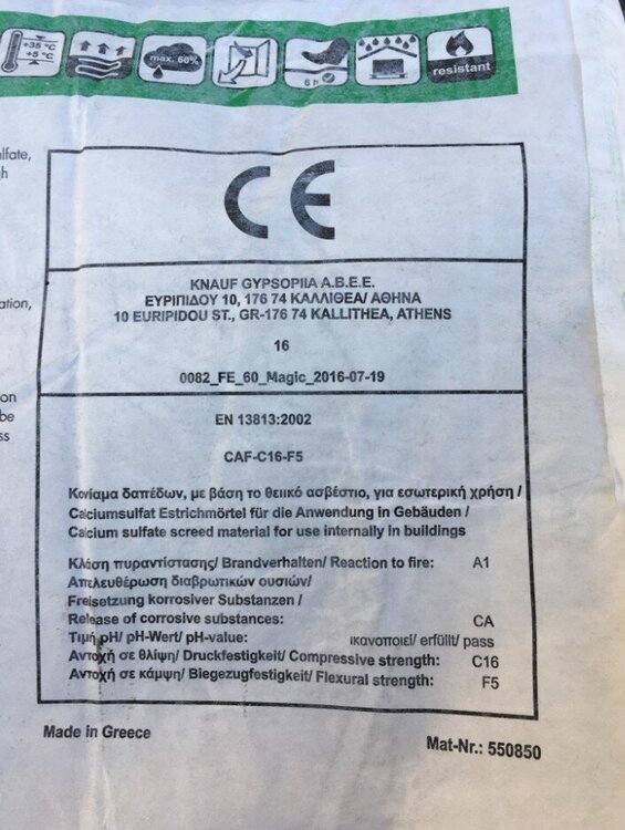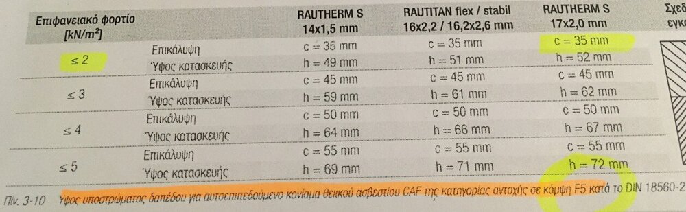 Καλημερα. Επανερχομαι στο θεμα μετα απο λιγο καιρο. Τελη του 2019 αποφασισα να ανακαινισω μια μικρη μονοκατοικια για να μεινω με την γυναικα μου. Αρχικα για να μην μπαινω σε μεγαλες φασαριες ειχα σκεφτει να βαλω ενδοδαπεδια ξηρης δομησης πανω απο το υφισταμενο πατωμα. Ανοιξα και νεο θεμα εδω για να ακουσω γνωμες απο κοσμο που εχει βαλει ηδη τετοιο συστημα. Εγκατελειψα γρηγορα την ιδεα της ξηρης δομησης μετα απο συζητηση με παλιο συμφοιτητη (ευτυχως). Αποφασισα να ξηλωσω τα πλακακια, την τσιμεντοκονια γεμισματος, να φτασω στην πλακα και να φτιαξω μια συμβατικη εγκατασταση ενδοδαπεδιας θερμανσης με σωληνα 17*2. Μπελαλιδικη δουλεια αλλα εχω εργαλεια και γνωριζω, και δεν γινοταν αλλιως. Στην τελικη του μορφη το σπιτι θα εχει τρια δωματια ακομη. Δυο μικρα υπνοδωματια και μια τραπεζαρια ακομη. Δηλαδη μιλαμε για συνολικα 70τ.μ. θερμαινομενης επιφανειας δαπεδου. Μιας και κανεις δεν ερχεται επαρχια για να στρωσει 30 τμ ενδοδαπεδια, προσεγγισα καποιες εταιριες ωστε να μου φτιαξουν μελετη εφαρμογης και τα αναλογα σχεδια, και να μου πουλησουν και τα υλικα για ολο το σπιτι. Να στρωσω τωρα οτι ειναι να στρωσω, και τα υπολοιπα οταν χτισω. Να μην τα πολυλογω, δεν εβγαλα ακρη. Κανεις δεν θελει ετσι 3 χιλιαρικα, ασχολουμενος λιγακι για να βγαλει μελετη που θα την πληρωθει και εξτρα. Ουτε παζαρια εκανα, ουτε τιποτα.Πιο πολυ με απογοητευσε γνωστος μηχανολογος εκ συμπρωτευουσας, που εχει δυνατο ονομα στα μηχανολογικα φορουμ...κριμα... Τελικα εκανα αυτο που ηθελα να αποφυγω. Περασα στο thermocad την κατοψη του σπιτιου, και εκανα λιγους υπολογισμους. Πυκνωση 5εκ στο μπανιο, 10 στα υπνοδωματια, 7.5 σε κουζινα καθιστικο. Κυκλωματα με μηκη απο 60-70 μετρα. 13 στο συνολο. Παρηγγειλα τα υλικα σε τοπικο μαγαζι. Επειδη στην επαρχια/νησι δεν μπορεις να βρεις τα οικοδομικα υλικα που βρισκεις στερια, και επειδη θα εριχνα τις τσιμεντοκονιες μονος μου, αποφασισα να αποφυγω ενα αμφιβολο αποτελεσμα/αβεβαιοτητες εφαρμογης και (μετα απο συζητηση με την μηχανολογο της εταιριας των υλικων) να αγορασω σκονη για αυτοεπιπεδουμενο θειικου ασβεστιου(caf κατηγοριας καμψης F5) Ξηλωσα τα δαπεδα, πηρα αλφαδιες, εριξα μια ψιλη τσιμεντοκονια 1-1.5cm για να πατησουν οι μονωτικες πλακες σε επιπεδο υποβαθρο. Οταν στεγνωσε περασα κατι εξογκωματα με διαμαντοτριβειο για να πατησουν οι πλακες σωστα. Οπου ειχε σοβαντεπια που ξηλωσα περασα κολλα πλακιδιων για να κολλησει η περιμετρικη ταινια. Οι μορφοπλακες που αγορασα βγαινουν μεχρι 30χιλ παχος. Συμφωνα με το παρακατω για δαπεδο πανω στο εδαφος ή πανω απο ΜΘΧ παμε σε 1,25*0,030=37,5χιλ μονωτικο Εβαλα συμπληρωματικα 2 εκ εξηλασμενη κατω απο την 3αρα μορφοπλακα, συνολικα 5εκ μονωσης. Εστρωσα τις πλακες, και εφτιαξα μια ανεμη (με λιγο δομικο χαλυβα που ειχα ευκαιρο). Ο χαλυβας που ερχοταν σε επαφη με την κουλουρα τυλιχτηκε με ταινια για να μην γδαρω την σωληνα. Μπηκε το ερμαριο Τυπωσα τα σχεδια απο το πλεξιμο και εστρωσα τα (5 για την ωρα) κυκλωματα Γεμισα το δικτυο νερο, και το αφησα πρεσσαρισμενο σε 3 bar. Την επομενη και αφου δεν ειχα πτωση πιεσης εριξα αυτοεπιπεδουμενη τσιμεντοκονια. Την μια μερα εριξα 11-12τμ (υπνοδωματιο), και την επομενη την κουζινα (20τμ). Συμφωνα με τις οδηγιες της rehau ελαχιστο υψος 35χιλ για φορτια μεχρι 2kN/τμ. Εριξα 40χιλ υψος. Καταναλωση 17κιλα σκονη ανα χιλιοστο και τμ. Ή αλλιως, εφαγε περιπου 2 τονους η κουζινα με τα 20τμ και 1 τονο σκονης το υπνοδωματιο με τα 11τμ. Κοστος 