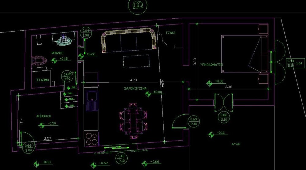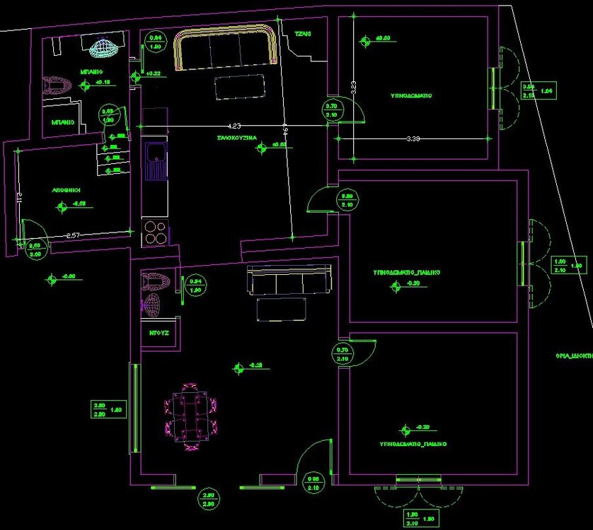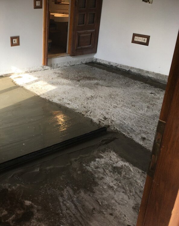 Οπως νομιζεις μιλτο. Αν προκειται να γινει μεγαλη συζητηση το διαχωριζεις. Αλλιως ισως να μην εχει ιδιαιτερο νοημα Ειχα συζητησει με καλο φιλο σοβατζη, ειχα σκοπο να χρησιμοποιησω μπετονιερα 1/4 σακου, να γυριζω τον καδο και απο κατω να τσουλαει το υλικο σε σεσουλα κτλ. Με απετρεψε και μου ειπε να χρησιμοποιησω αναδευτηρα χειρος γιατι αλλιως θα εμεναν πολλοι σβωλοι. Ευτυχως. Χρησιμοποιησα αργοστροφο αναδευτηρα βαρεου τυπου (παλιο γαλλικο δραπανο). Το υλικο το ανακατευα σε δυο αυτοσχεδια πλαστικα δοχεια με δυο χερουλια ψηλα και ενα χαμηλα. Κουβαλημα εντος του σπιτιου, και "μπαταρισμα" με το ενα χερουλι ψηλα και το ενα χαμηλα. Εκ των υστερων σκεφτομαι ποσο ΑΝΟΗΤΟΣ ημουν, που δεν ειχα standby δευτερο αναδευτηρα για παν ενδεχομενο. Η παραγωγικοτητα εξαρταται/περιοριζεται απο τα χερια του χειριστη και τον συντονισμο ολων... Με εναν να μετραει ακριβως το νερο και να το αδειαζει στο δοχειο, αλλον ενα να αδειαζει ενα τσουβαλι στο δοχειο, εμενα να χτυπαω το μειγμα και να κουβαλω μεσα τον κουβα, και αλλον εναν να βοηθα την διαστρωση και την επιπεδωση, η παραγωγικοτητα ηταν ~60 τσουβαλια(1800-2000kg σκονης, 2200-2440 kg υγρου μιγματος) σε 2 ωρες, με εργασιμοτητα 120-150min... δηλ τσιμα τσιμα. Στην βορεια ευρωπη ερχεται το συνεργειο με την πρεσσα και σου ριχνει ολο το σπιτι σε χρονο 0... Η περιμετρικη ηταν με κολλα (λεμε τωρα) και ειχα σφηνωσει τις μορφοπλακες οσο καλυτερα γινεται. Με σηκωμενο το φιλμ της περιμετρικης, σφηνωνα λωριδες εξηλασμενης οπου ειχε κενα. Κατοπιν κατεβασα το φιλμ και εστρωσα. Γυρω απο τον παγκο της κουζινας που δεν εστρωσα σφηνωσα το φιλμ στη θεση του με ρεταλια σωληνα απο τον συλλεκτη (αφηνα λιγο παραπανω σωληνα και εκανα συνδεσεις και πρεσσαρισμα την επομενη) Την επομενη, περιεργως ειδα οτι παρολο που ειχα υπερσφηνωσει τα παντα καπου ειχα λιγα μικρα κενα. Ξυραφι και λωριδες αφρολεξ αναμεσα σε φιλμ και περιμετρικη. Δεν σηκωθηκε τιποτα, ουτε ειχα προβλημα. Ε καπου θα περασε λιγο ζουμι... δεν γινεται πιο καλο. Αυτο που βοηθησε στην εφαρμογη ηταν σημαδι με μαρκαδορο στα 40χιλ υψος γυρω γυρω σε ολη την περιμετρικη. Παταγα πανω σε κοιλοδοκο40αρι ακουμπισμενο στην περιμετρικη, και αλλος τραβαγε γραμμη. Ενδεικτες υψους οπως χρησιμοποιουν στην βορεια ευρωπη δεν βοηθησαν σε τοσο μικρο μερος Ειναι αμεσως μετα την διαστρωση. Βατοτητα σε 6 ωρες αν θυμαμαι καλα. Οταν στεγνωσε εγινε γκρι ματ σκουρο, οταν εχασε ολη την υγρασια του μετα την τεχνητη ξηρανση εγινε ανοιχτοχρωμο γκρι. Γιατι οχι. -
