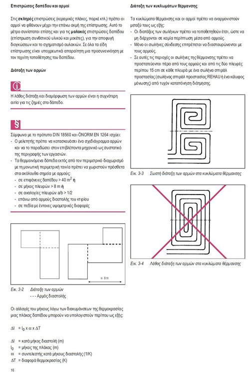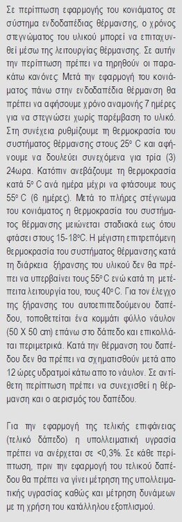 Τι μορφοπλακα εβαλες? Δεν γνωριζω αν το κλασσικο μειγμα θα παει παντου, το αυτοεπιπεδουμενο αν αναδευτει σωστα και δεν εχει σβόλους θα παει παντου. Οπως καταλαβαινεις δεν πακτωνουν αρμο οσο ειναι υγρο. Ειτε κολλας ειδικο τεμαχιο αρμου διαστολης σχηματος Τ με αυτοκολλητο στο κατω μερος, ειτε κοβεις με τεραστια προσοχη αρμο την επομενη. Ισχυουν τα κλασσικα στον σχεδιασμο των αρμων διαστολης, αλλα επειδη το υλικο δεν διαστελλεται πολυ (αυτο ειδα και εγω) χωροι μεχρι 10m διαγωνιου δεν χρειαζονται αρμο. Δες τα ακόλουθα περι αρμων, αλλα υπο το πρισμα σχεδιασμου μεγαλυτερων χωρων. Αν εχεις αποριες μιλα με την εταιρια, ο τεχνικος τους θα σε κατατοπισει Οχι. Αναμονη 7 μερες χωρις θερμανση, και μετα σιγα σιγα εφαρμογη θερμανσης. Προσωπικα δεν ανεβασα πανω απο 45 κελσιου. Το αφησα εκει μια βδομαδα. Σιγουρα τελειωνεις γρηγοροτερα απο οτι θα τελειωνες με κλασσικο θερμομπετο. Πρωτον γλιτωνεις δυο βδομαδες στην αρχη, και δευτερον εχεις να αποβαλλεις λιγοτερο νερο, αφου εριξες υλικο μικροτερου παχους/μαζας... Συγνωμη που αργησα να απαντησω παντως. Οτι θελεις ρωτα. Δες και εδω -